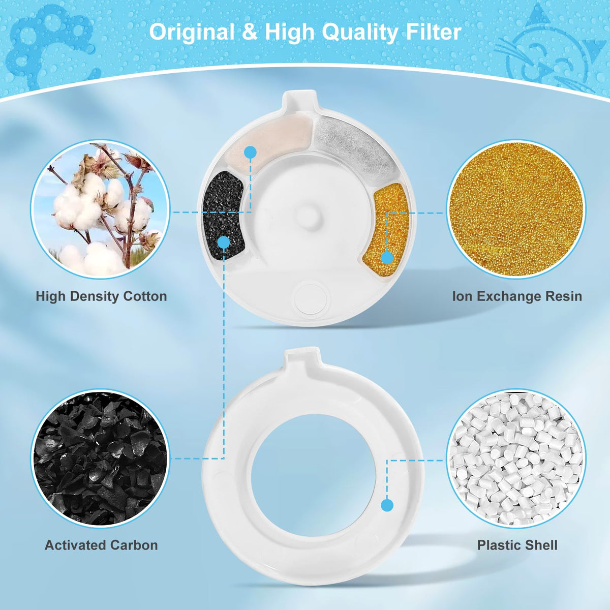 YOIHABV PET SUPPLIES, help you to take better of your pets. Specifications: Compatible Fountain: 3L With Filter/3.6L/4.6L/6L/8L automatic pet waterer Model: 228 Filtration System: High-density filter cotton can filter hairs and sediment; Activated carbon can remove chlorine and odor, and preserves minerals; Ion exchange resin can filter heavy metals Material: PP, cotton, activated carbo and Ion exchange resin Warm Tip: Please soak and rinse filter with running water Replacement Frequency: Every 30-45 days Package List: Filter * 4 Small Brush * 1