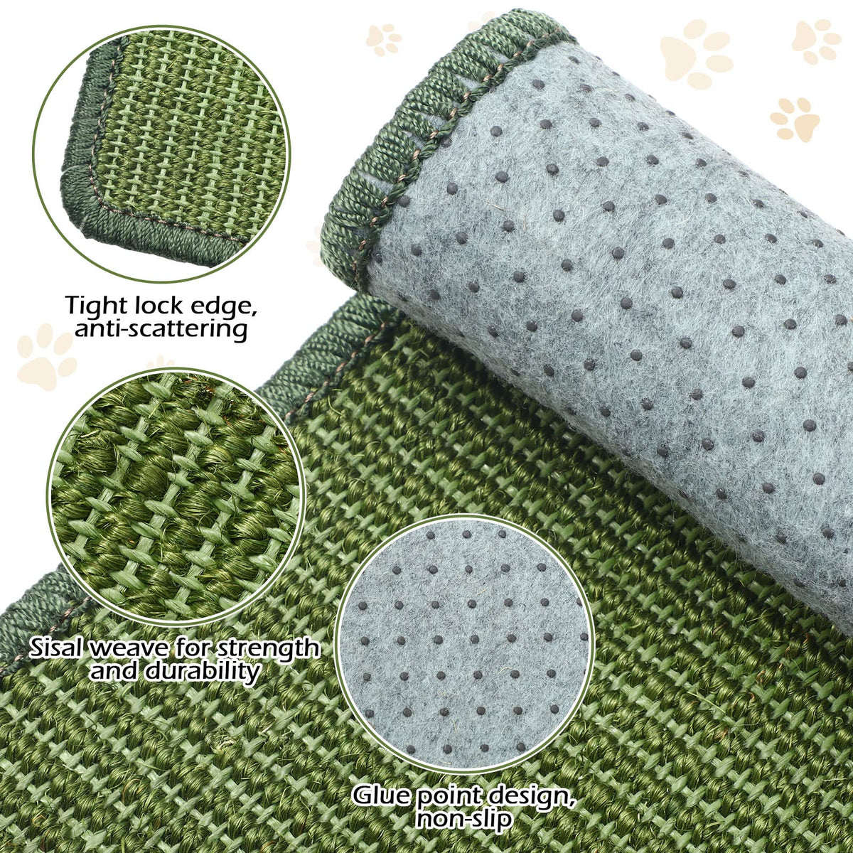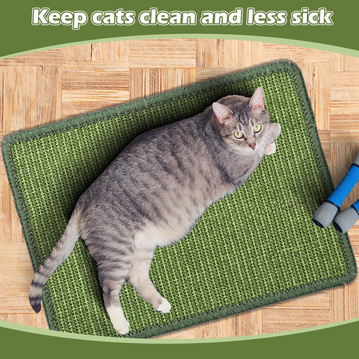 Features: Multiple functions: The long scratching mat is made from woven sisal with a stable backing that will not fall off on your floor while your kitty playing with it. The versatile design allows you to use it as a scratch pad, sleeping pad, cat litter mat, or even as a mat door. Anti skid design: The bottom is made of non slip latex, which increases its thickness and stability, making it not easy to slide. Protect the paws: Satisfy your cat's love for the protector mats and pass on his/her love to the mat. Keep your cat busy and keep her paws healthy. Specifications: Main material: sisal Color: green Size: approx. 11.8 x 15.7 inches/ 30 x 40 cm Package Includes: 4 x Cat scratch mats Notes: Manual measurement, please allow slight errors on size. The color may exist a slight difference due to different screen displays.