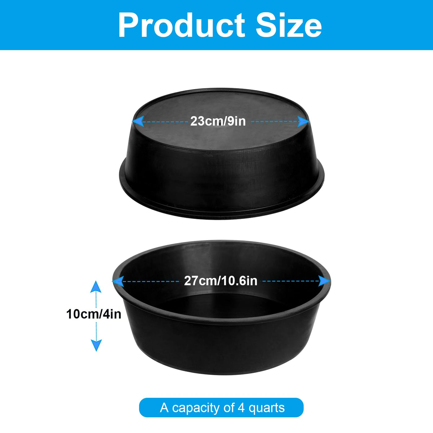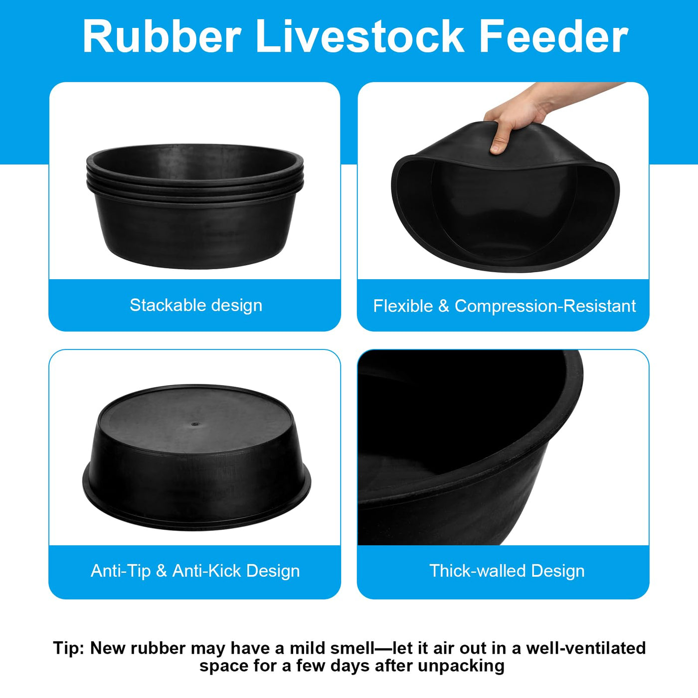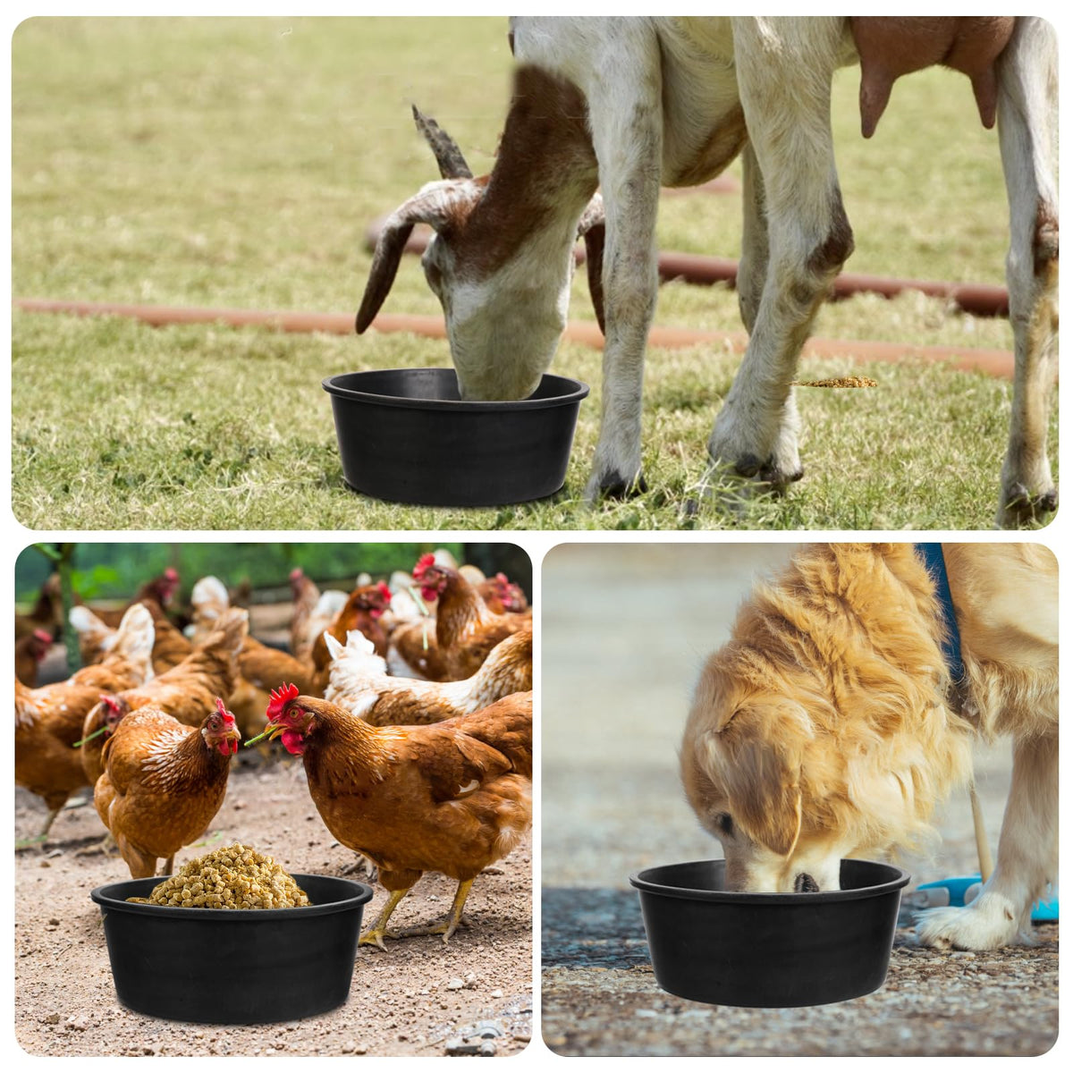 Rubber feed pan for horse horse cats dogs chickens ducks goats pigs and farm small animal. Material:Rubber Size:10.6 x 4.1 Inches. Capacity:4 Quart. Package include:4 4 x Feed pans.