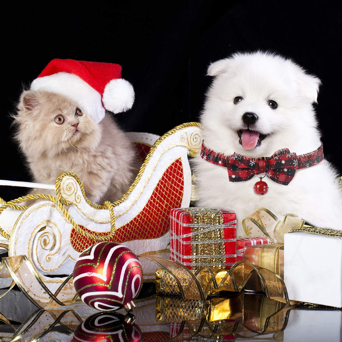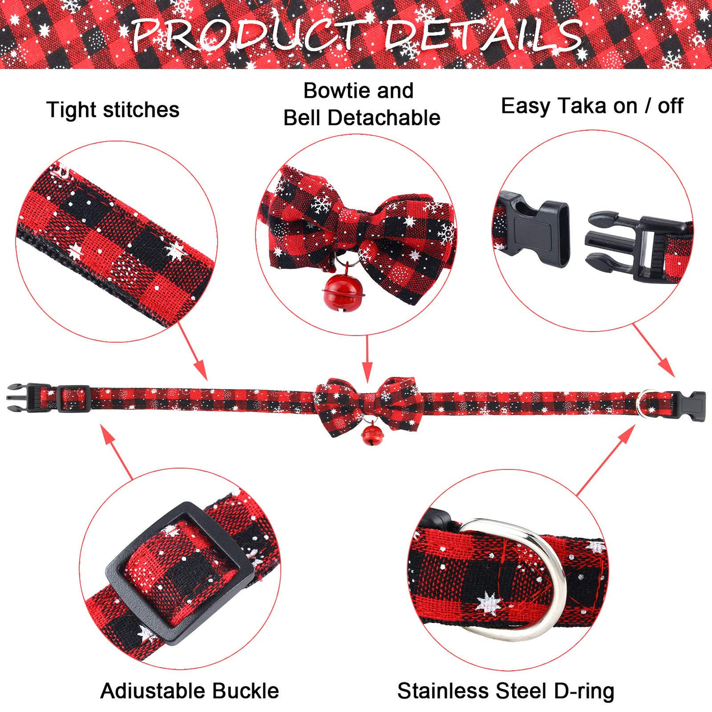 Enhance festive vibes:This pet bandanas and collars set designed with classic red green plaid and snowflake pattern enhance the warm festive vibes on Christmas day, can also be a charming decoration for pets, dogs, cats and so on, your family members and pets will have a good time.Soft material:The pet triangle kerchief and neck tie are made of quality and soft material, skin-friendly and comfortable for pets, giving your pets a nice experience. The plastic buckles on the collars are convenient to use, durable and long lasting, easy to clean and care for. Christmas gifts: These plaid snowflake bandanas and collars are the nice gift for your dogs, cats, pets. It will great for Christmas holiday, birthday party and other festival parties. These classic plaid pattern bandanas and collars make your dogs and cats look stylish.Specification:Material: polyester webbingColors: as pictures shownSize: L: approx. 25.1 x 16.5 x 16.5 inches, the pet neck tie can be adjusted and the neck circumference is approx. 14.8 to 25.1 inches and 0.8 in widthS: approx. 22 x 15.2 x 15.2 inches, the pet neck tie can be adjusted and the neck circumference is approx. 11.8 to 15.7 inches and 0.8 in widthPackage include:1 x Red plaid snowflake dog bandana 1 x Red and green plaid snowflake dog bandana1 x Red plaid snowflake dog neck tie with bell1 x Red and green plaid snowflake dog neck tie with bellWarm note:The colors may exist slight difference due to different screens, please in kind prevail.Manual measurement, please allow slight errors on size.