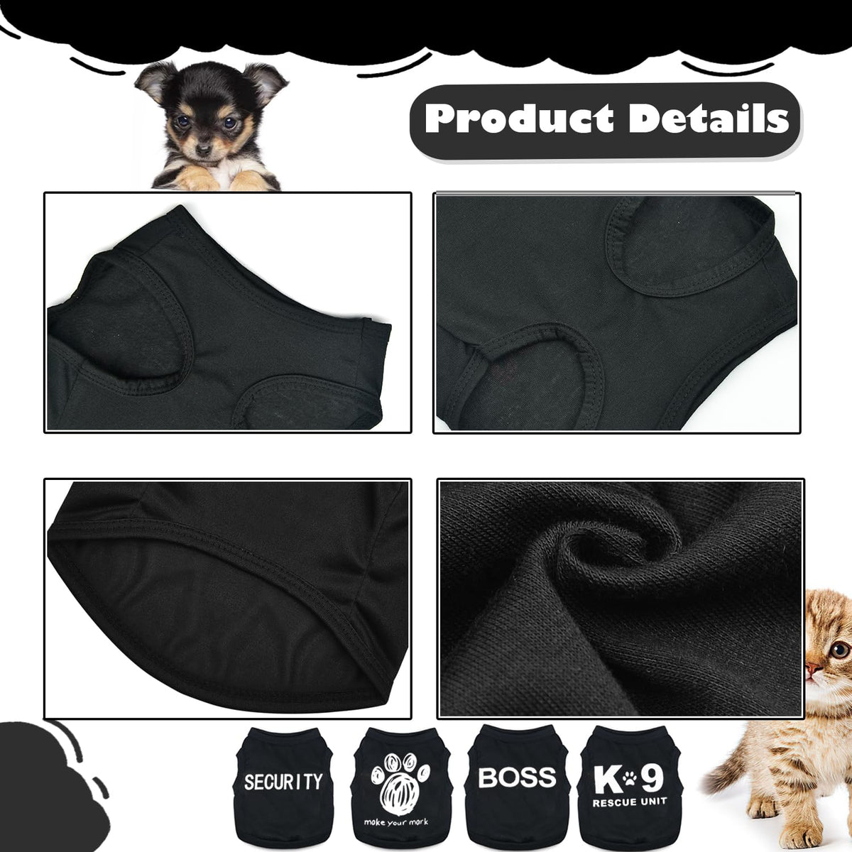 Small Dog Shirt, 4-Pack Dog Clothes For Small Dogs Girl Boy, Breathable Cotton Teacup Chihuahua Clothes, Sleeveless Small Yorkie Puppy Clothes Outfit Cat Vest Package Content : 4 Pieces Black Dog Clothes Pattern:Security,K9,Dog Paw Size Data Xx-Small: Chest Girth(11.81''), Back Length(7.48''), Suggested Weight(1.5-3.3Lb) X-Small: Chest Girth(13.71''), Back Length(9.44''), Suggested Weight(3.4-5.2Lb) Small: Chest Girth(15.74''), Back Length(11.41''), Suggested Weight(5.3-7.5Lb) Medium: Chest Girth(17.71''), Back Length(13.38''), Suggested Weight(7.6-9.9Lb) Recommend Breeds Of Dog:Kitten, Cat, Tiny Puppies, Teacup, Chihuahua, Yorkie, Pomeranian, Maltese, Toy Poodle, Bichon, Min Pin, French Bulldog, Poodle, Shih Tzu, Spaniel Westie, Pug, Boston Terrier, Chiweenie, Corgi, Cairn Terrier The Weight Is For Reference, Please Measure Your Pet Before Ordering; Please Priority Follow The Back Size; If Your Pet'S Size Is Close To The Upper Limit Of The Size Chart, Please Size Up. 4 Pieces Dog Clothes For Small Dogs Boy Summer Chihuahua Yorkie Clothes Spring Cute Dog Shirts Soft Breathable Black Puppy Clothes Tiny Dog Outfit Pet Cat Clothing S (Small)