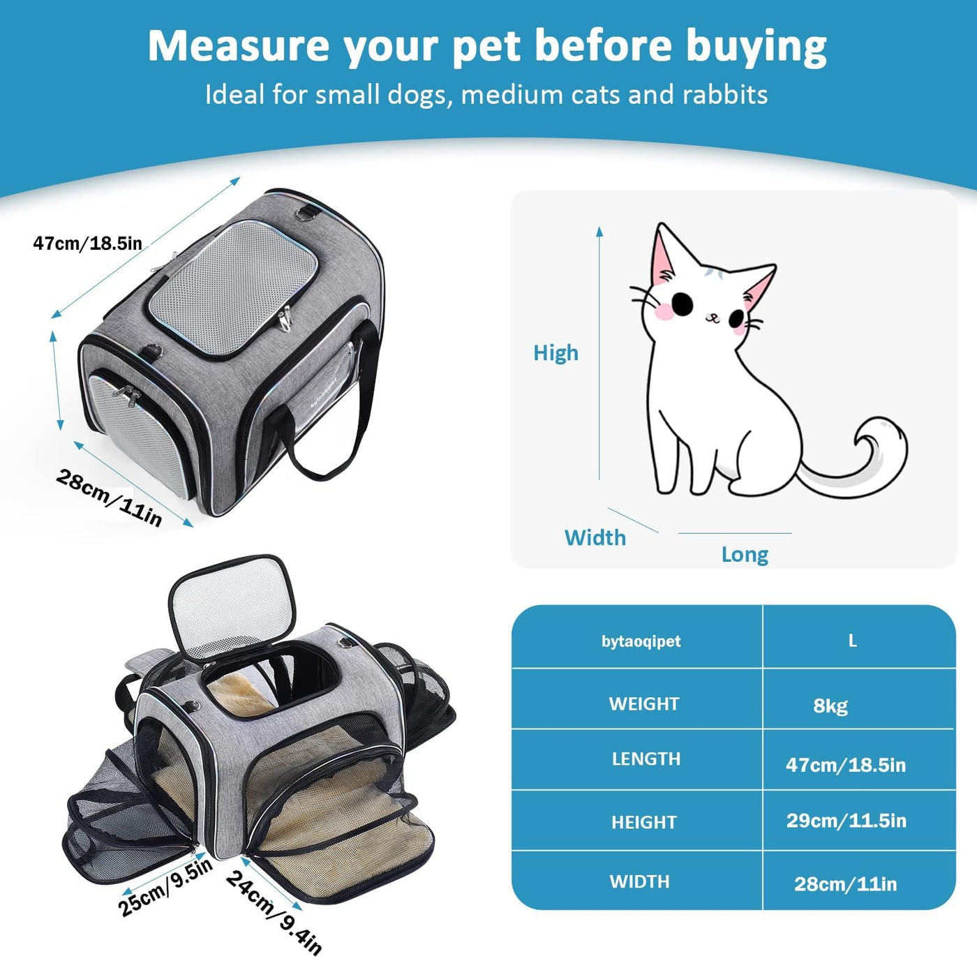 airline approved cat carrier size: 18 x 11 x 11nch Weight: 3 lbs The pet bag uses high-quality Oxford fabric and breathable-durable mesh.This soft-sided cat carrier comes with mesh windows giving plenty of openings and air for cat dog with top opening. The pet travel bag has an adjustable length shoulder strap and a suitcase fixing belt, can fixed on the car seat or suitcase. Folding design, convenient storage and space saving. The dog carrier allows your pet to move around more comfortably and reduces the anxiety of confinement. If you have any questions about our products, please feel free to contact us Cat Travel Bag 4 Sides Expandable Pet Carrier Airline Approved Folding Soft Sided Transport Tote Bag for Kittens, Puppies & Small Animals with Removable Fleece Pad