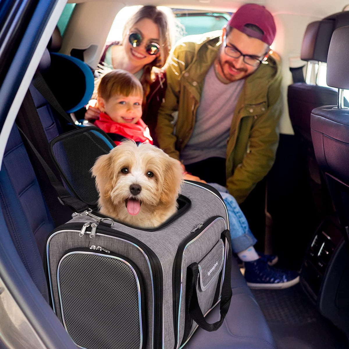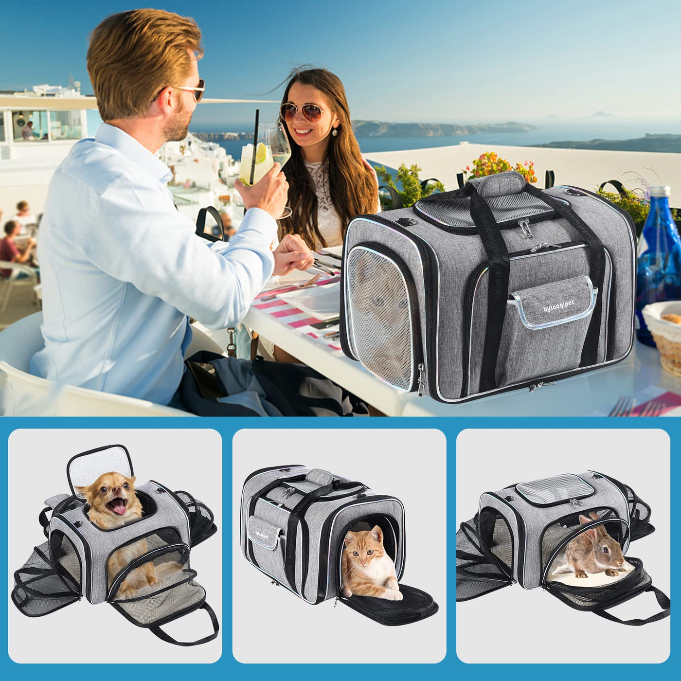 Q: How does the four-way expansion feature work?A: Each side of the carrier can be expanded to provide additional space for your pet, allowing for more comfort during travel or at home.