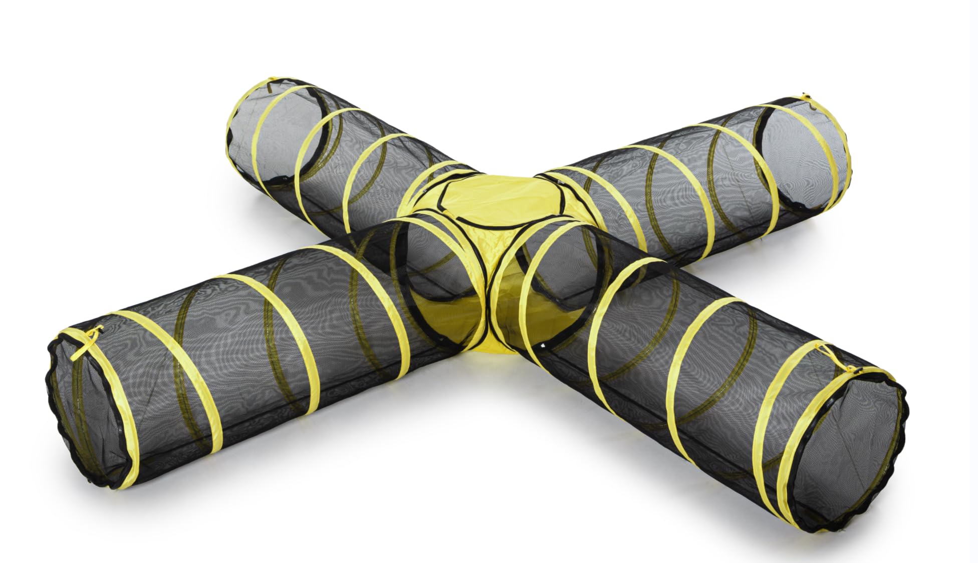 This 4-Way Cat Tunnel Set Transforms Any Space Into A Pet Playground! Featuring Four Breathable Mesh Tunnels And A Central Cube, It Encourages Natural Hunting Instincts While Providing Cozy Hideouts