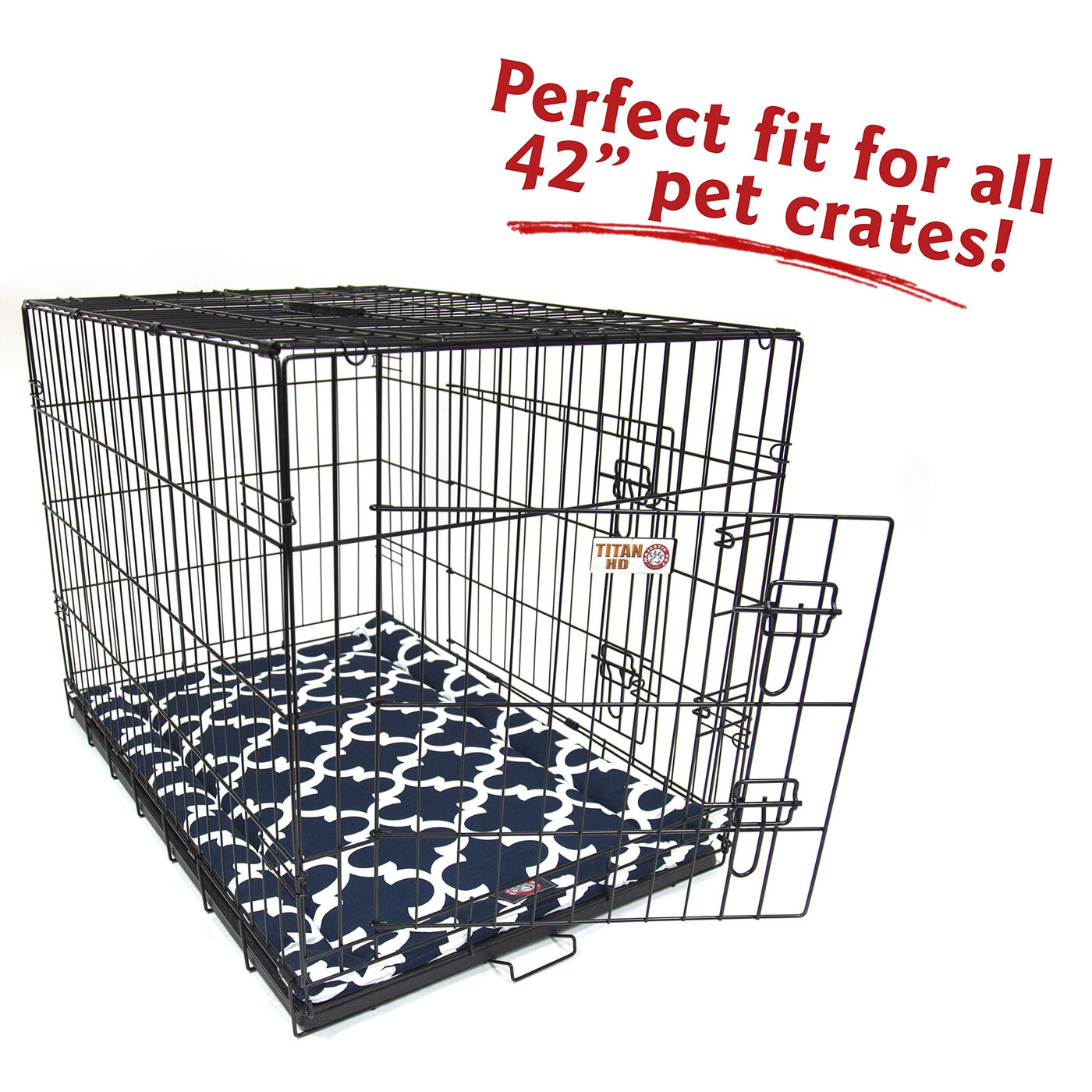42 Inch Trellis Navy Blue Crate Dog Bed Mat By Majestic Pet Productsdimensions: 42 In. X 26 In. X 1.5 In.Outside Material: Poly / Cotton Twillinside Filling Material: Premium High Loft Polyester Fiber Filwashing Instructions: Place Entire Bed In Washer On Gentle Cycle And Tumble Dryindoors Or Outdoors, These High-Quality Dog Crate Mats Are Just What Your Dog Needs To Keep Them Rested And Ready For Their Next Adventure.The 42 Inch Trellis Navy Blue Crate Dog Bed Mat By Majestic Pet Products Is Stuffed With Super Premium High Loft, Yet Soft Polyester Batting, Which Ensures An Orthopedic And Snug Rest Anywhere In The House With Unbeatable Comfort.These Mattress Dog Mats Are Perfect For Use In Crates, Carriers, Dog Houses, Vehicles, Cages Or Just Around The House And Are Perfect For Pets Of All Sizes, From Small To Large.The Outer Covers Are Woven From Durable Outdoor Treated Polyester With Up To 1000 Hours Of U.V. Protection With Added Water And Stain Resistance.Machine Washable, Place Entire Bed In Washer On Gentle Cycle And Tumble Dry For Easy Cleaning.Based In Irvine, Ca, Majestic Pet Products, Inc. Is A Leading Pet Products Manufacturer. Majestics Roots Date Back To 1994 When They Started Producing Dog Collars And Leashes And Has Since Expanded Their Product Line To Include A Variety Of Pet Beds, Cat Trees, Crates, Gates And More. The Majestic Team Includes Some Of The Most Talented Product Developers, Graphic Designers, Customer Satisfaction Aficionados And Marketing Pros, All Lead By A Top Notch Management Team. Majestics Continuous Development Of Modern And Innovative Products Has Garnered Them A Reputation Of Quality And Excellence Within The Industry. Our Mission At Majestic Pet Is Simple, It Is To Create Quality Products, That Offer Great Value And Provide Exceptional Customer Service, All While Sharing In Our Success To Support Worthy Causes. Our Promise To You Is To Continuously Offer The Finest Products And Customer Service In Order To Keep You And Most Importantly, Your Pets Happy. You Can Find Majestic Products Sold Nationwide Through Leading Online And Brick And Mortar Retailers.