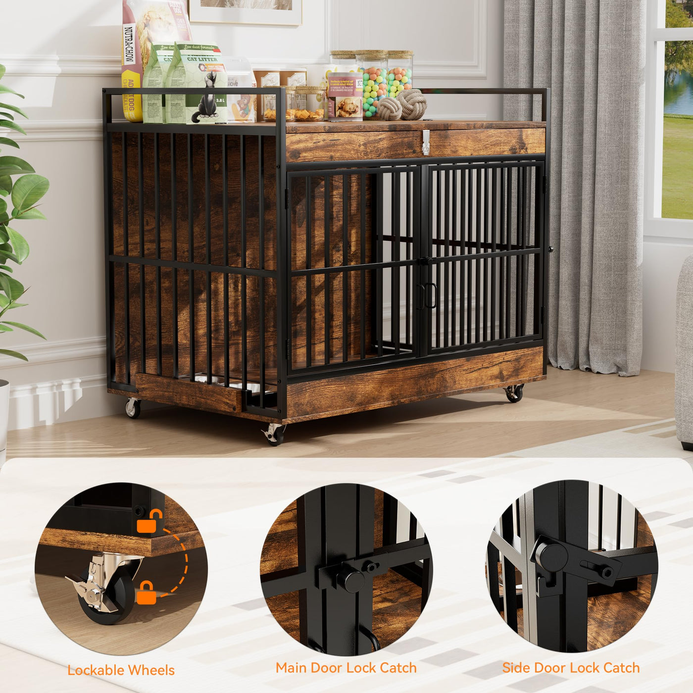 Ideal for medium to large breeds, this escape-proof dog crate offers a generous 45W x 37D x 30H interior for comfort and movement. Built with strengthened metal and chew-resistant wood, it ensures safety and durability. Features dual-door flexible access, includes two stainless steel bowls, and easily adapts to your home layout. Quick to assemble with dedicated customer support-perfect for a functional and stylish pet space!
