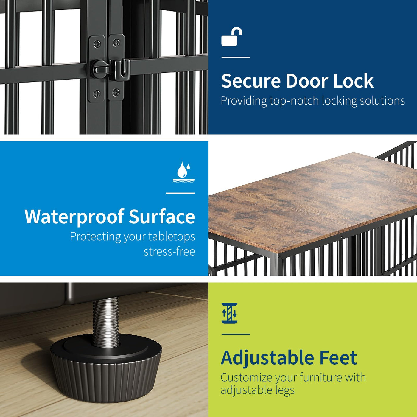 Large Pet Relaxation Space: Featured 46.7x 28.3x 37.4 size, the dog crate offers ample space for medium to large breeds, allowing your pet to stretch out without stress, providing the perfect environment for rest or play | Practical Sophistication: Beyond serving as a secure and spacious dog crate, it seamlessly doubles as a stylish end table, nightstand, or room divider. The sturdy top offers support for displaying decor or keeping daily items | Triple-Door for Convenience: Designed with easy visit, the cage features 3 different direction doors, making it easy for your pet to access the crate from multiple angles, providing unmatched flexibility and ease of use | Long-Lasting Strength: Built to stand the test of time, the sturdy dog crate features a heavy-duty metal frame and reinforced wooden panels, ensuring durability and stability, preventing bending, breaking, or warping | Effortless Assembly Process: Setting up your cage is simple and stress-free, thanks to its clear instructions. All necessary hardware and tools are included, allowing you to assemble quickly without professional skills