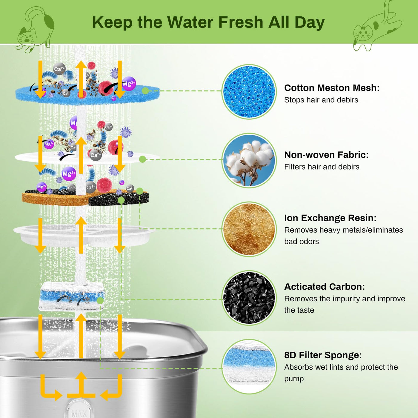 5-Pack Cat Fountain Filter Replacement For Round 67Oz/2L Automatic Pet Fountain, Triple Filtration System Activated Carbon Filters For Stainless Steel Dog Dispenser Water Bowl