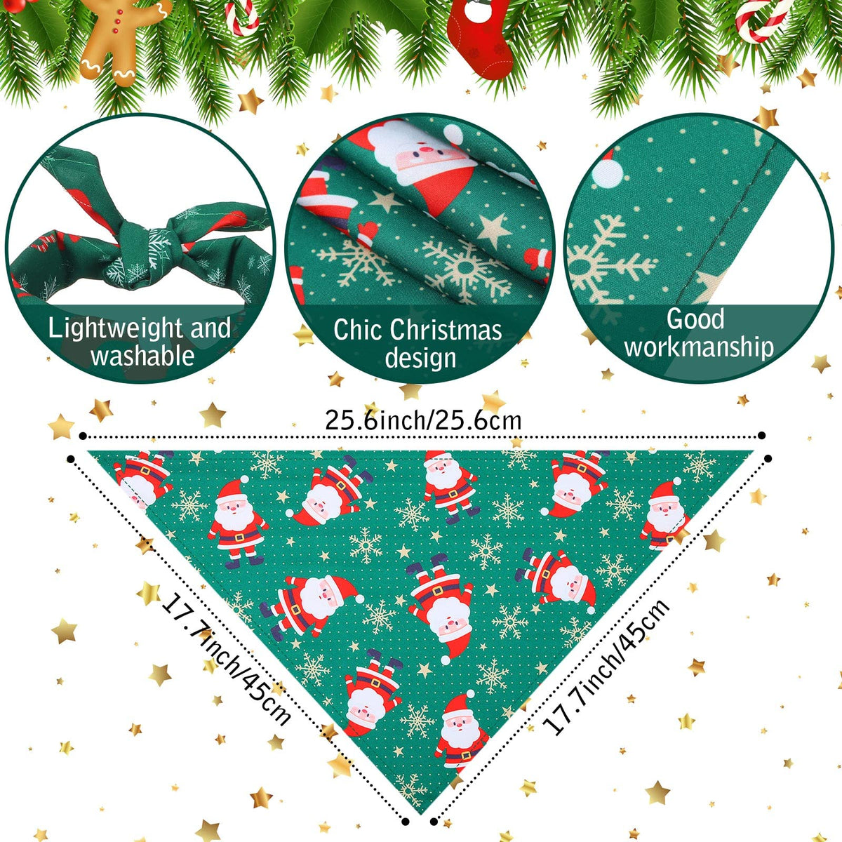 Q: What sizes are available for the Christmas dog bandanas?A: The Christmas dog bandanas are approximately 25.6 x 17.7 x 17.7 inches (65 x 45 x 45 cm), making them suitable for most dog sizes. They can also be folded and adjusted for a snug fit.