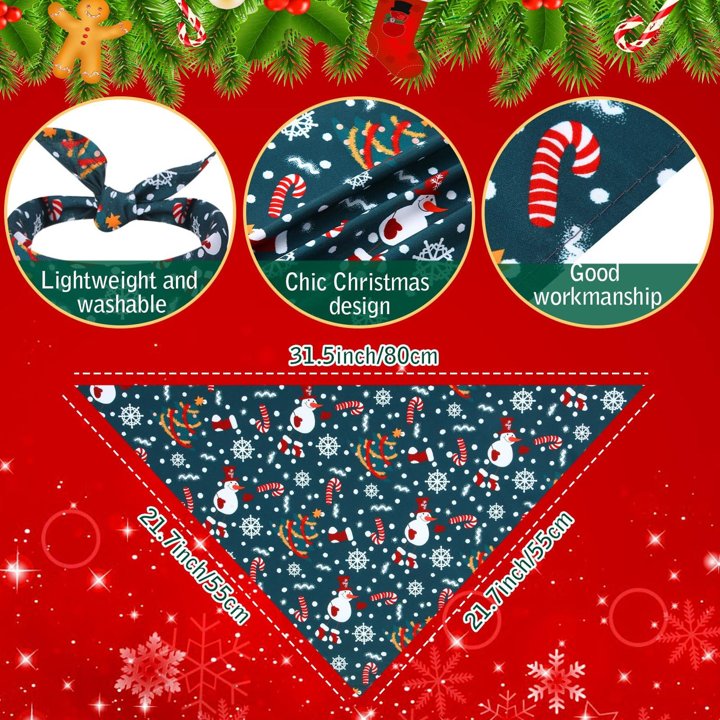 Features: Easy to wash and fold: These Christmas dog bandanas can be folded for easy storage and portability. Hand wash and machine wash are both available, making it easy to change and wash every day. Specifications: Material: polyester Size: approx. 31.5 x 21.7 x 21.7 inches/ 80 x 55 x 55 cm Color: as pictures shown Package includes: 50 x Christmas Dog bandanas Notes: Manual measurement, please allow slight errors on size. The color may exist a slight difference due to different screen displays. Please measure the size of your pet before buying. Please adjust it according to the size of the pet to avoid suffocation.