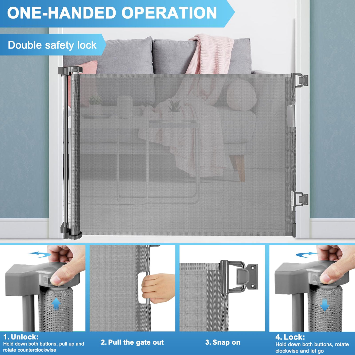 KISKIZ 56-Inch Indoor/Outdoor Retractable Gate, a versatile solution designed to safeguard children and pets. Features: Flexible Width: Easily extends from 0 to 56 inches, perfect for securing bottom stairs, doorways, hallways, outdoor decks, and more. Safe Barrier for Kids and Pets: Creates a secure boundary, ensuring safety indoors and outdoors. Space-Saving Retractable Design: Conveniently rolls up to save space when not in use, perfect for high-traffic areas. Easy One-Hand Operation: Adults can effortlessly open/close the retractable pet gate with 1 hand. Safety Locking Mechanism: Children and pets won't figure out how to unlock the child safety gate once securely latched. Soft and Sturdy Mesh: Provides a gentle yet strong barrier, preventing bumps and scratches during playtime. Trip Hazard Elimination: Unlike metal gates, these are no bottom bars, eliminating trip hazards. Fits Any Baseboard: Adjustable hardware ensures a perfect fit for any baseboard height. Easy Installation: Includes all necessary hardware and step-by-step manual for quick installation. Certified Safety: Complies with ASTM or EN standards, ensuring reliable protection for your loved ones.
