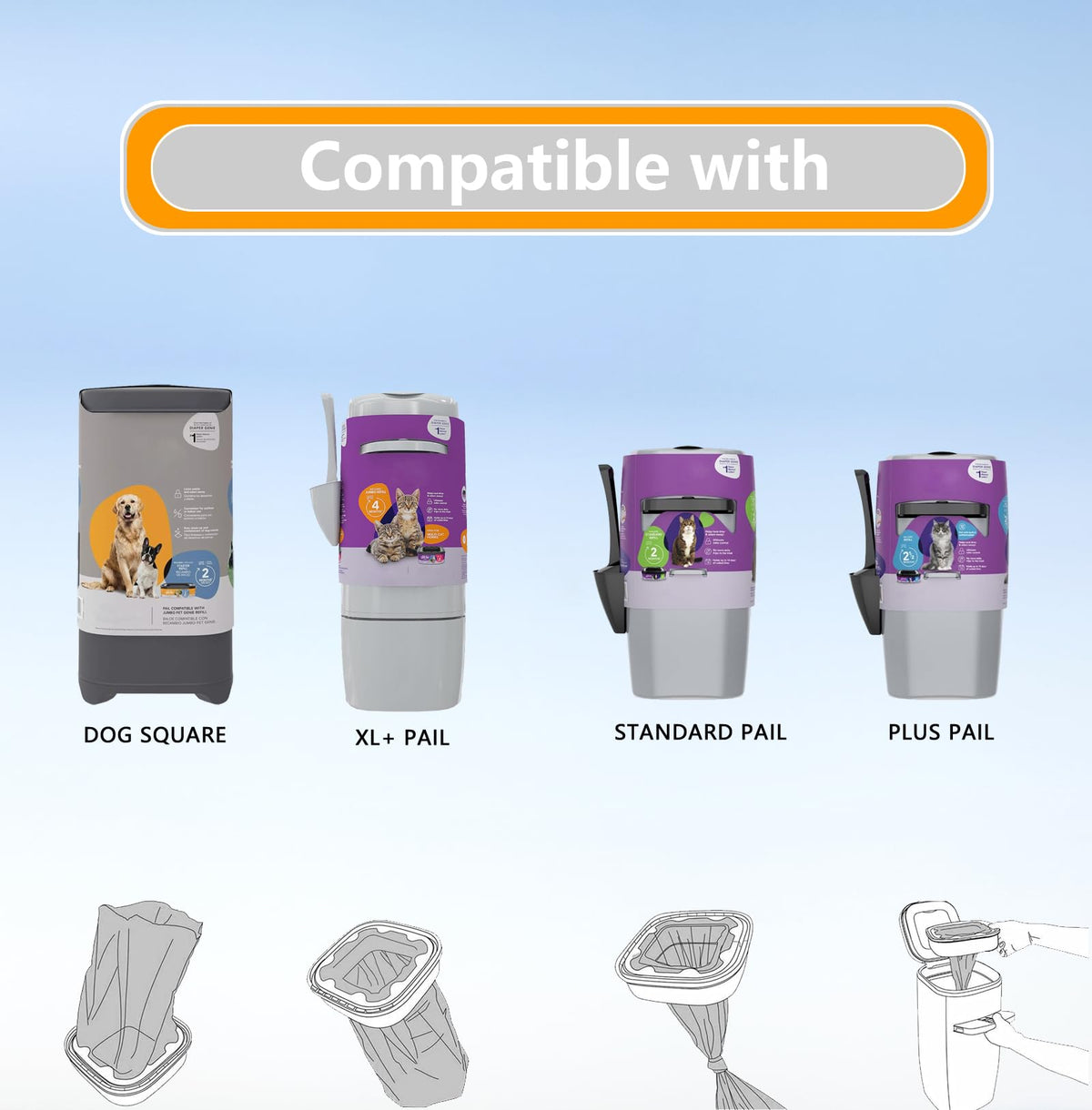 Each 28 Ft Long Refill, Compatible With Your Standard, Plus,Xl+, Save Your Money, Especially For Cat Lovers. Note: Including A Non-Original Cartridge The Refills Use The Best Material, And Each Refill Is Made Of 7 Layers Film The Refill Bags Are Easy To Assemble, Please Follow The Manual In The Package. Easy To Assemble, Simply Pull Out A Bit Of Film, Push It Through The Center Of The Cartridge And Tie A Knot At The Bottom. Then, Open The Lid And Funnel Of The Pail, Place The Cartridge On Top, And Push The Refill All The Way. Simple Installation Can Save You A Lot Of Time. Package: 6 Pack Of Refills, 1 User Manual And A Non-Original Cartridge Are Included