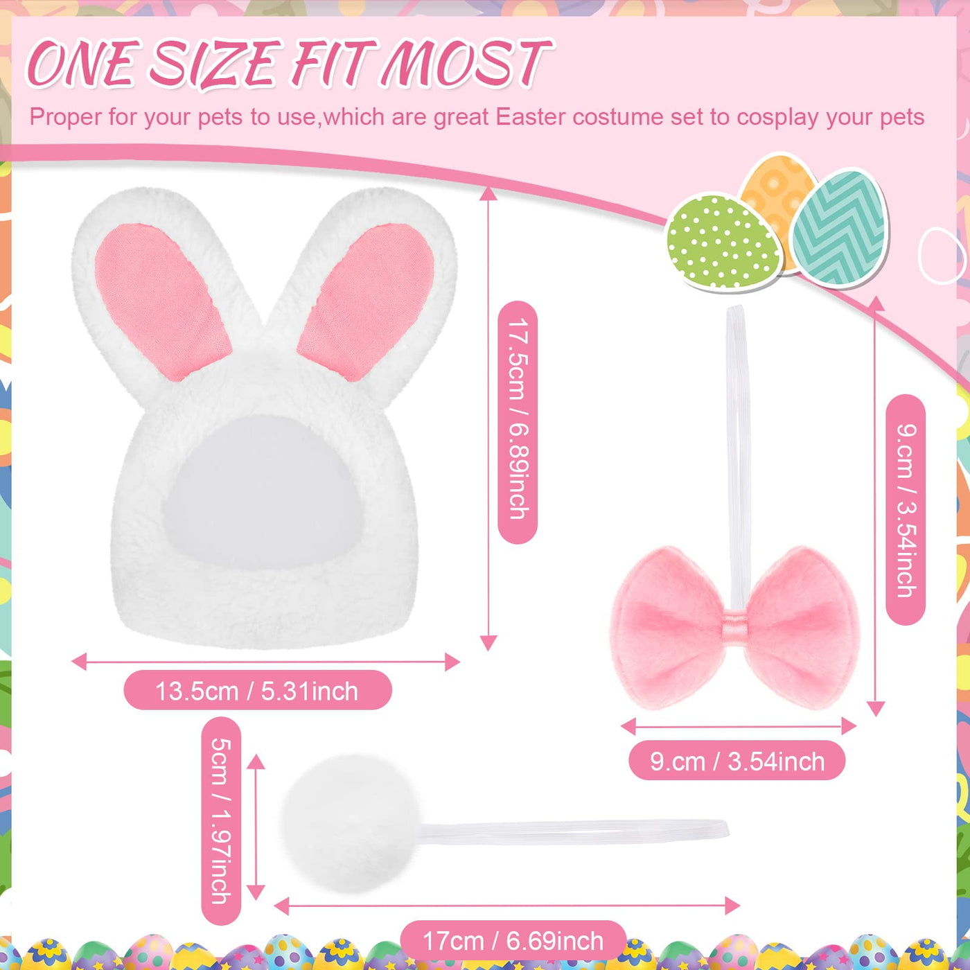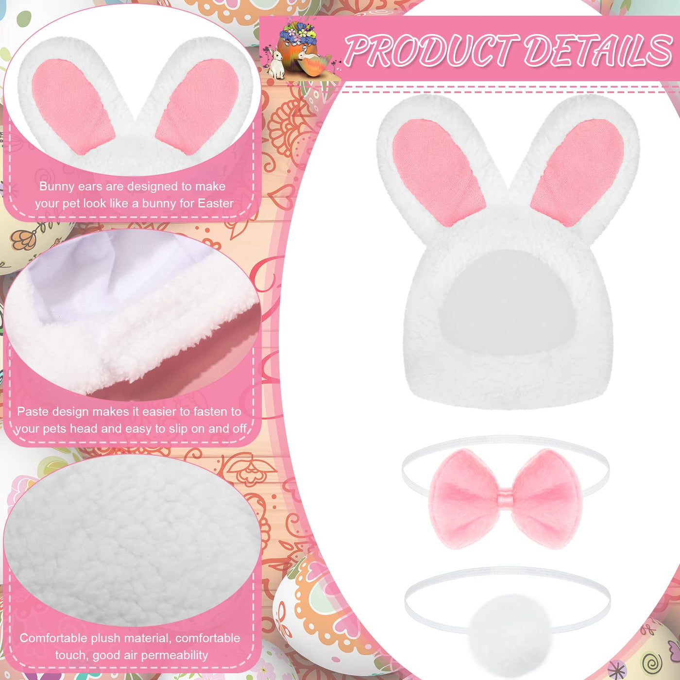 Features: Light In Weight: These Easter Bunny Rabbit Costume Is Made Of Lightweight Fabric, And Will Not Make Pets Feel Uncomfortable Or Heavy When Wearing The Bunny Head Cover, Bow Tie Or Bunny Tail, Making Your Pets Move At Ease When Wearing Bunny Accessories. Easy To Clean: The Pet Bunny Outfit Is Soft And Comfortable To Touch, Mainly Painted In White, Bringing You A Pleasant Visual Feeling, And They Can Be Washed By Hands And Washing Machine, Saving Your Time And Effort In Cleaning. Specifications: Material Of Hats: Berber Fleece Main Material Of Bow Ties And Tails: Plush Fabric Color: As Pictures Shown Size: As Pictures Shown Quantity: 6 Pieces In Total Package Includes: 2 X Bunny Rabbit Hats With Ears 2 X Pet Bowties 2 X Pet Bunny Tails Notes: Manual Measurement, Please Allow Slight Errors On Size. The Color May Exist Slight Difference Due To Different Screen Displays.