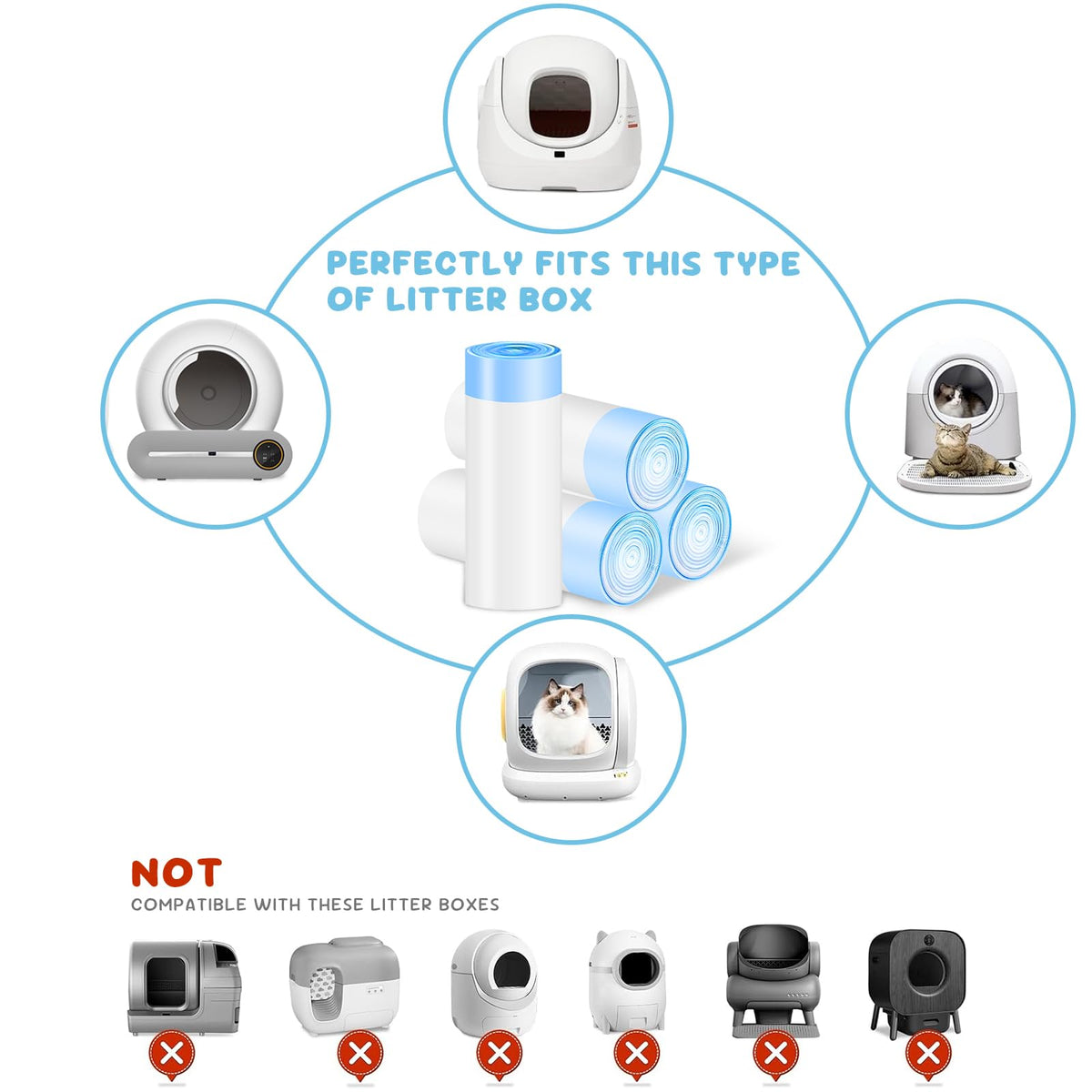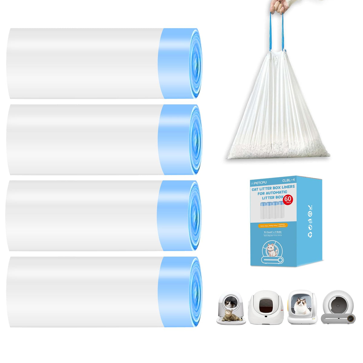 As A Pet Cat Owner, Do You Have Below Frustrations? 1. Cleaning The Litter Box Is A Hassle. 2. Clumps Stick To The Bottom And Are Hard To Remove. 3. Garbage Bags Tear Easily. 4. Litter Gets Scattered Everywhere. 5. Inconvenient To Carry Around. 6. Waste Bag Lack Of Handles, Making Difficult To Hold. Why Choose Our Litter Liners? 1. Compatibility Fit For: Designed For Most Automatic Self-Cleaning Litter Box To Ensure High Performance, Leak Proof & Heavy Duty. 2. Durability: These Reusable Litter Liners Reduce Waste By Lasting Longer Than Other Liner Replacement. 3. Easy To Installation: Simply Wrap The Edges Of The Liner Over The Rim Of The Opening Of Waste Storage And Tighten The Rope Of The Waste Bag. 4. Easy To Cleanup: It Cleans Easily, Clumps, And Removes Easily. These Trash Bags Are Great For Litter. Features: 1. Custom Fit For Self-Cleaning Litter Boxes Designed Specifically For Automatic Self-Cleaning Cat Litter Boxes, These 17.7'' X 19.7'' (45Cm X 50Cm) Liners Seamlessly Fit 10-12L Litter Box Systems. Avoid Leaks, Jams, Or Misalignment During Cleaning. 2. Leak Proof & Heavy Duty Made From Plastic Material, These Liners Are 30% Heavy Duty Than Standard Options. Reinforced Seams And Anti-Tear Technology Prevent Messy Leaks, Even With Heavy Clumping Litter Or Multi-Cat Households. 3. Upgraded Drawstring Closure Quickly Seal Waste With The Easy-Pull Drawstring Design - No Need To Touch Waste! Tight Closure Locks Odors In And Ensures Hassle-Free Disposal. 4. Abundant Quantity For Extended Use Each Package Contains 60 Count Pet Waste Bags, Organized Into 4 Rolls For Convenient Dispensing. With Individual Bag Dimensions Of 19.7 X 17.7 Inches (50 X 45 Cm) And 3.2 Gallon (12L) Capacity, And Our Cat Litter Disposal Bags Provide A Generous Supply To Meet Your Pet'S Daily Use. 5. Functionality & Cost-Effective Works With Open-Top, Enclosed, Or Smart Cat Litter Boxes. Doubles As A Heavy Duty Trash Bag For Pet Waste, Diapers, Or Household Use. Specifications: Waste Bag Dimensions: 17.7 X 19.7 Inches (45Cm X 50Cm) Quantity: 4 Rolls / 60 Count Liner Capacity: 3.2 Gallon (12L) Material: Plastic About Litter Liner: Dot-Break Design For Easy Tearing And Immediate Use, Locate The Bag Notch To Grasp The Drawstring, Convenient To Use, Resistant To Dripping And Leakage, Puncture-Resistant, Constant Temperature Heat-Sealing Technology, Leak-Proof, Compatible With Various Bucket Types, Strong Load-Bearing Capacity For Easy Cleaning, Durable Without Breakage, High Toughness, Resistant To Pulling And Stretching. Packing Included: 4 Pack X 60 Count Cat Litter Box Liners