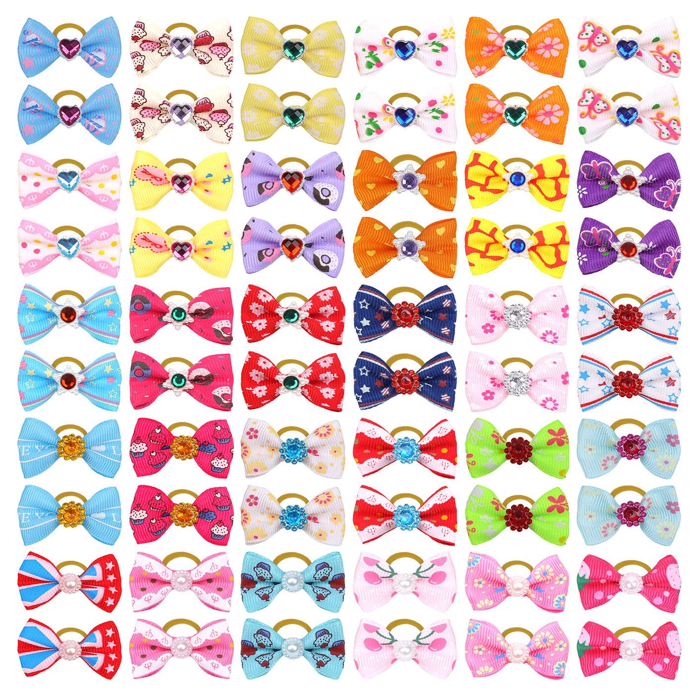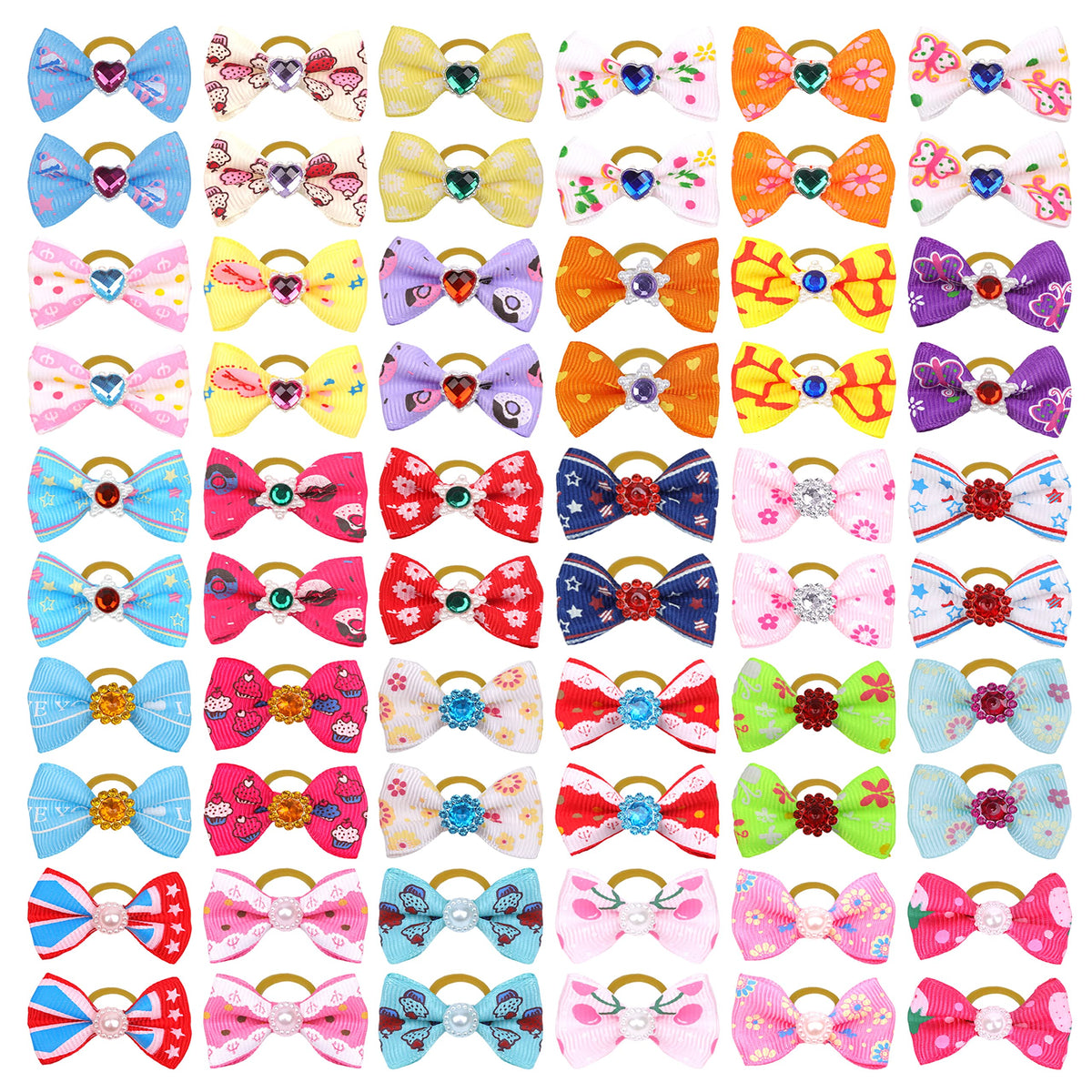 60Pcs Puppy Dogs Hair Barrettes Bows With Rubber Bands,Rhinestone Tiny Christmas Bowknot Hair Bows Hair Topknot Hair Clips For Cat Puppy Party Birthday,Handmade Hair Accessories Pet Grooming