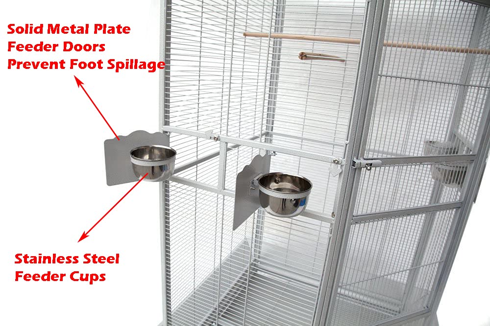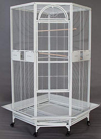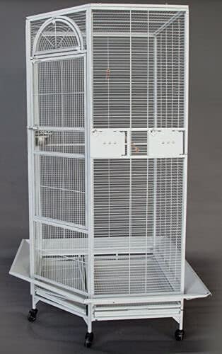 Features: Space Saving corner design Large access door makes placing and removing your bird an easy task! Top opens to create a accessible play top Slide out grates for easy cleaning, keeps your bird safe inside. Sliding out removable tray for easy cleaning and waste removal. 2 Large wood perches. 4 Swing feeder gates with feeder bowls 360 degree surround seed skirt Cage features vertical and horizontal bars for your birds climbing pleasure. Powder coating finish, free from Zinc and Lead toxicants. Castors for easy moving about. Specification: Bar Spacing: 1/2 Bar Gauge: 3/32 and 1/8 Finish: Powder coating finish, safe from toxins harmful to birds Dimensions: H63.5 x 30 x 30(without seed skirt) Door size: H32 x W15.5 Included Accessories: Slide out tray: 2 Slide out grate: 2 Feeder Doors: 4 Feeder Cups: 4 Access doors: 1 Perches: 1 Ideal for: Budgies, Parakeets, Cockatiels, Lories, Love Birds, Parrotlets, Conures, Pionus, Senegals, Jenday and any similarly sized small to medium birds.