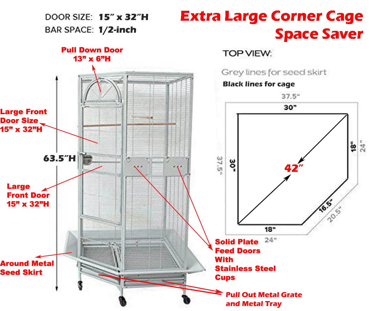 64 Extra Large Corner Flight Bird Parrot Cage for Cockatiel Parakeet Budgies Parrot with Around Metal Seed Skirts, Tight 1/2-Inc