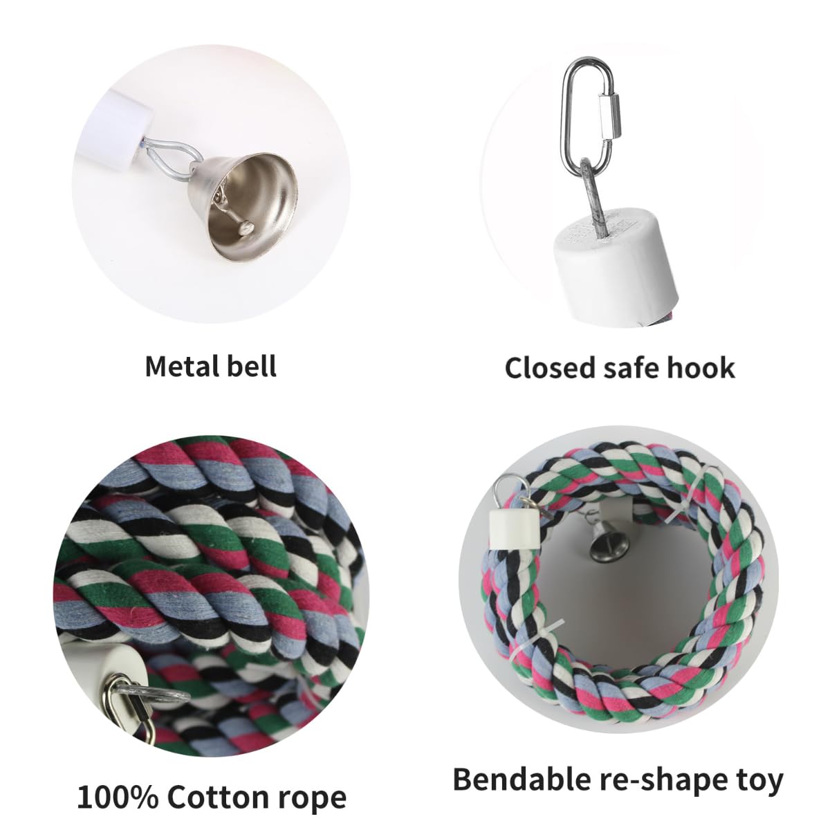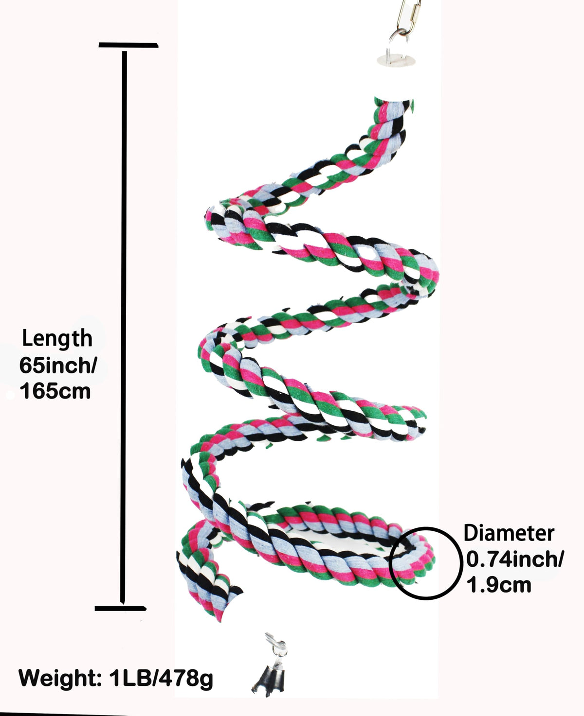 [QUANTITY] 1Pcs 65inch rope bird perch [WEIGHT] 1lb/478g [SIZE] Length 65inch fully extended,Diameter:1.9cm/0.74inch [MATERIAL] Heavy duty parrot rope 100% soft cotton cover with steel wire inside easy of chewing natural bird perches WARM REMINDER: The parrot toy colors may vary slightly depending on your computer or mobile phone screen setting