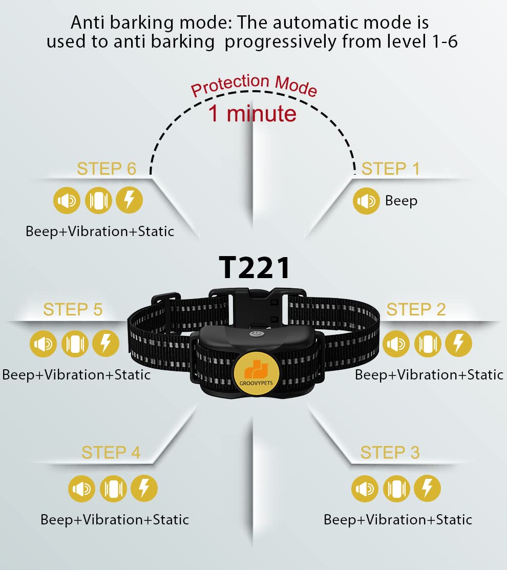 Key Features Groovypets Model T221 Has 650 Yard Remote Range And Has 3 Proven Training Methods Including Warning Beeping Tone,8 Levels Of Vibration And 16 Levels Of Static Shock. It Can Train Your Dog Either Puppy, Young Or Adult Dog Basic Obedience Commands And Correct Bad Behaviors Like Digging, Jumping On People, Chasing Cars Or Domestic Animals Or People, Bark / Barking Issue. Remote Dog Collar Has Astonishing Supper Long Standby Time(~90 Days) And 40 Days Of Normal Use With A Single Fully Charged Battery. Receiver Comes With Two Sets Of Metal Prongs(Short And Long) To Fit Different Coat Types. The Shock Collar Remote Has 650 Yd Remote Range. You Can Train Up To 3 Dogs Individually. Remote Has Belt Clip. You Can Set The Collar To Work As An Auto Anti-Bark Collar Without Using The Remote. Remote And Receiver Both Have Upgraded Rubber-Coated Finish, Make Them Look Good And Feel Nice In Hand. Ipx 5 Waterproof To Withstand Light Rain Or Water Splashes. Adjustable Collar Straps Are Made Of Nylon Fabric Material With Quick Release Clip Buckle Small Lightweight Training Collar Receiver With Solid Construction Collar Fits Small Medium And Large Dogs(6 -24 /15Cm-61Cm Neck Size). Collar W/Strap Weighs 3 Ounces/85 Grams, Receiver Size 2.5 X 1.25 X 1.25 (6.5 Cm X 3.3 Cm X 3 Cm). Receiver Without Strap Weighs 2 Ounces/60 Grams. Included Silicon Rubber Caps To Dampen Or Block The Shocks If Shock Is Not Needed For Training.