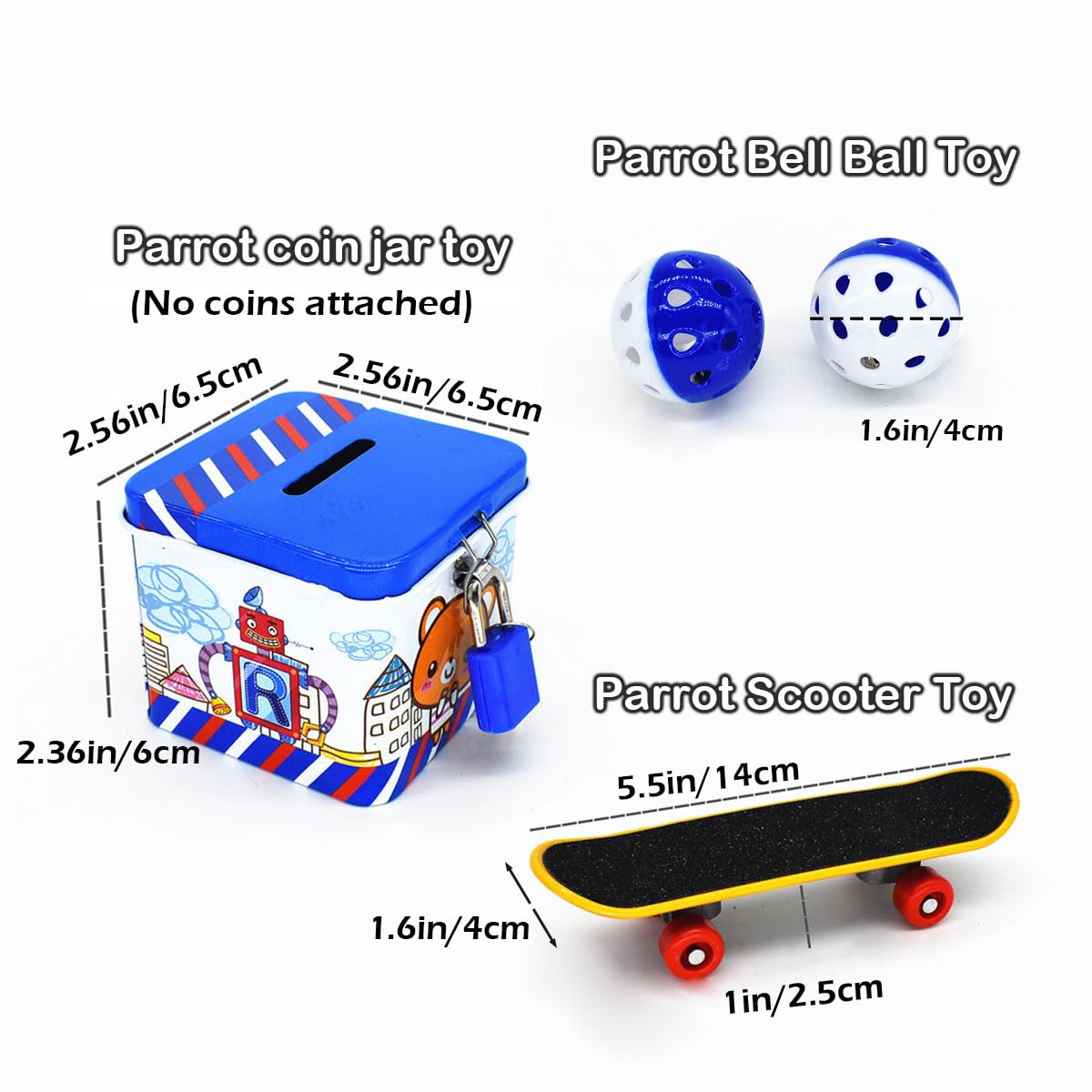 Package Include: 1 X Parrot Scooter Toy 1 X Parrot Ferrule Toy 1 X Parrot Cart Toy 1 X Parrot Coin Can Toys 2 X Parrot Bell Ball Toys This Parrot Toy Bring More Fun To Pets, Stimulate Their Curiosity And Desire To Explore, And Maintain A Better Mood And Healthier Body Through Exercise And Play. Applicable: Bird, Parrots, Parakeet, Cockatiel, Quaker, Conure, Budgie, Finch, Lovebirds.