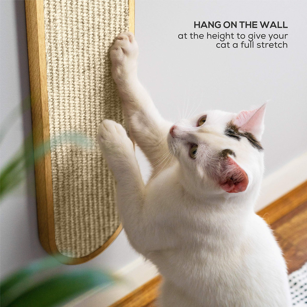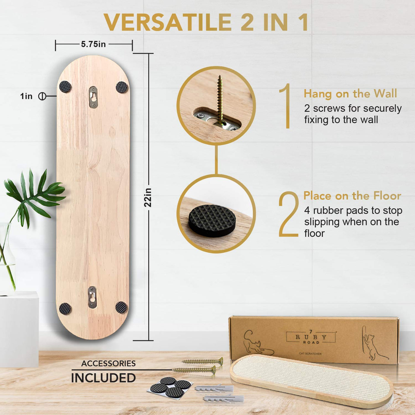 The Purrfect Cat Scratching Post Wall Mount And Cat Scratcher Furniture Protector To Stop Damage To Your Furniture. Your Sofa Is Not A Cat Nail File Scratching Post Our Wall Mounted Scratching Post Is! Our Modern Cat Scratcher Looks Great On Floors As A Floor Scratcher Or Hang It Up As A Corner Scratching Post For Cats For Space-Saving Feline Fun. Versatile, Use Our Cat Scratching Mat As A Floor Cast Scratching Board, Or As A Cat Scratching Post Wall Mounted For Kitties That Prefer A Vertical Cat Scratcher. Easy To Set Up, All Cat Hanging Scratching Post Tools Included - Screws, Cat Wall Scratching Post For Cats Plugs, Rubber Feet. The Cat Scratch Mat Is 22 Inches Long, 5.75 Inches Wide, 1 Inch Deep. Built For Play, Sturdy And Durable The Mounted Car Scratcher Frame Is Made From Eco-Friendly And Sustainable Wood And The Wall Mount Cat Scratcher Surface Is Made Of Woven Sisal. The Perfect Scratching Post For Cats For Cats Of Any Size Who Prefer A Cat Post Wall Mount. If You Want A Cat Scratching Deterrent For Furniture, The 7 Ruby Road Scratching Pads For Indoor Cats Is Purrfect For Them To Dig Their Claws Into. You Can Get Dull Wall Scratchers For Indoor Cats That Are Placed On The Floor Or A Vertical Scratching Post That Stays Static But Our Beautiful, Cute Mountable Scratching Post Is Both! Unlike Other Cat Scratching Posts For Indoor Cats This Is Versatile, This Wall Cat Furniture Doubles As A Horizontal Scratch Post With Non-Slip Pads For Floor Use. Perfect As A Cat Scratcher Wall For Indoor Cats For Old Adult Cats. Contains All Cat Wall Mount Tools. This Cat Scratching Pad Saves Space And Is Easy To Move To A Different Room Or Corner Of The House For Your Kitty. Keep The Cat Scratcher Wall Mounted And Itll Be Even More Compact! You Get: ? 1 Woven Cat Post For Wall, On An All Natural Wood Frame ? 2 Hanging Cat Scratcher Wall Anchors ? 4 Non-Slip Pads ? 1 Box Your Furry Friend Will Be Fascinated With And Love Just As Much As Their Cat Wall Mount Cat Furniture