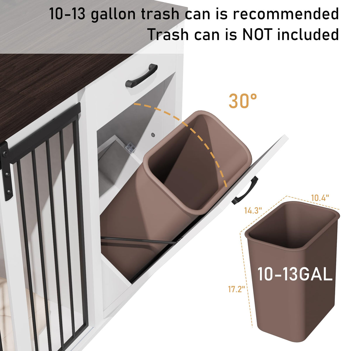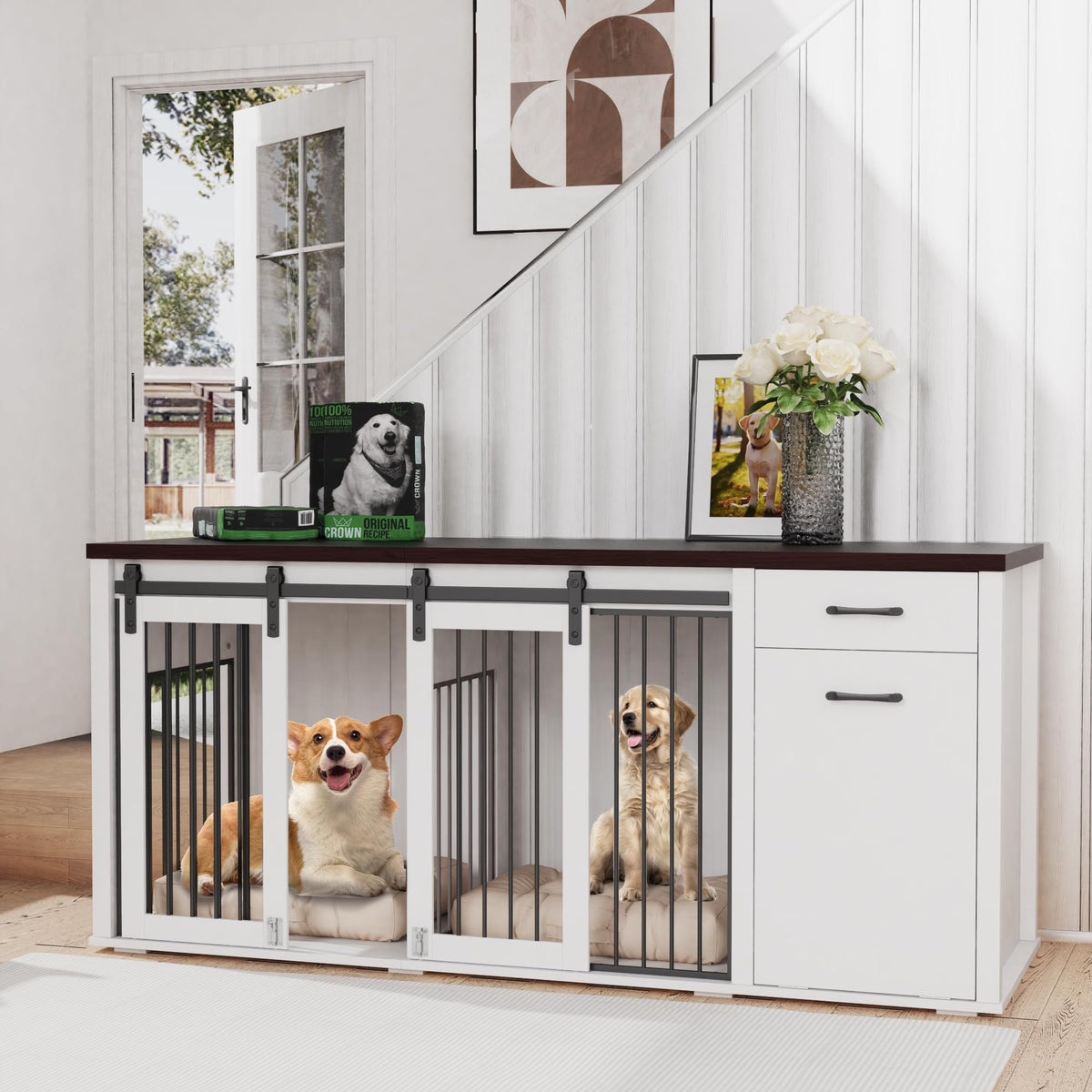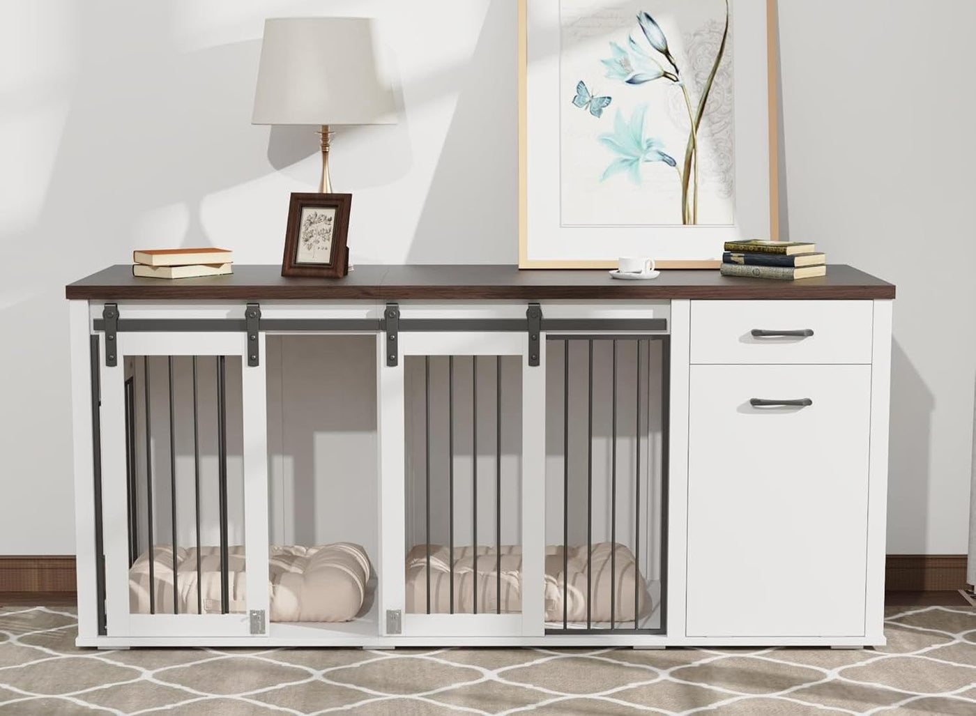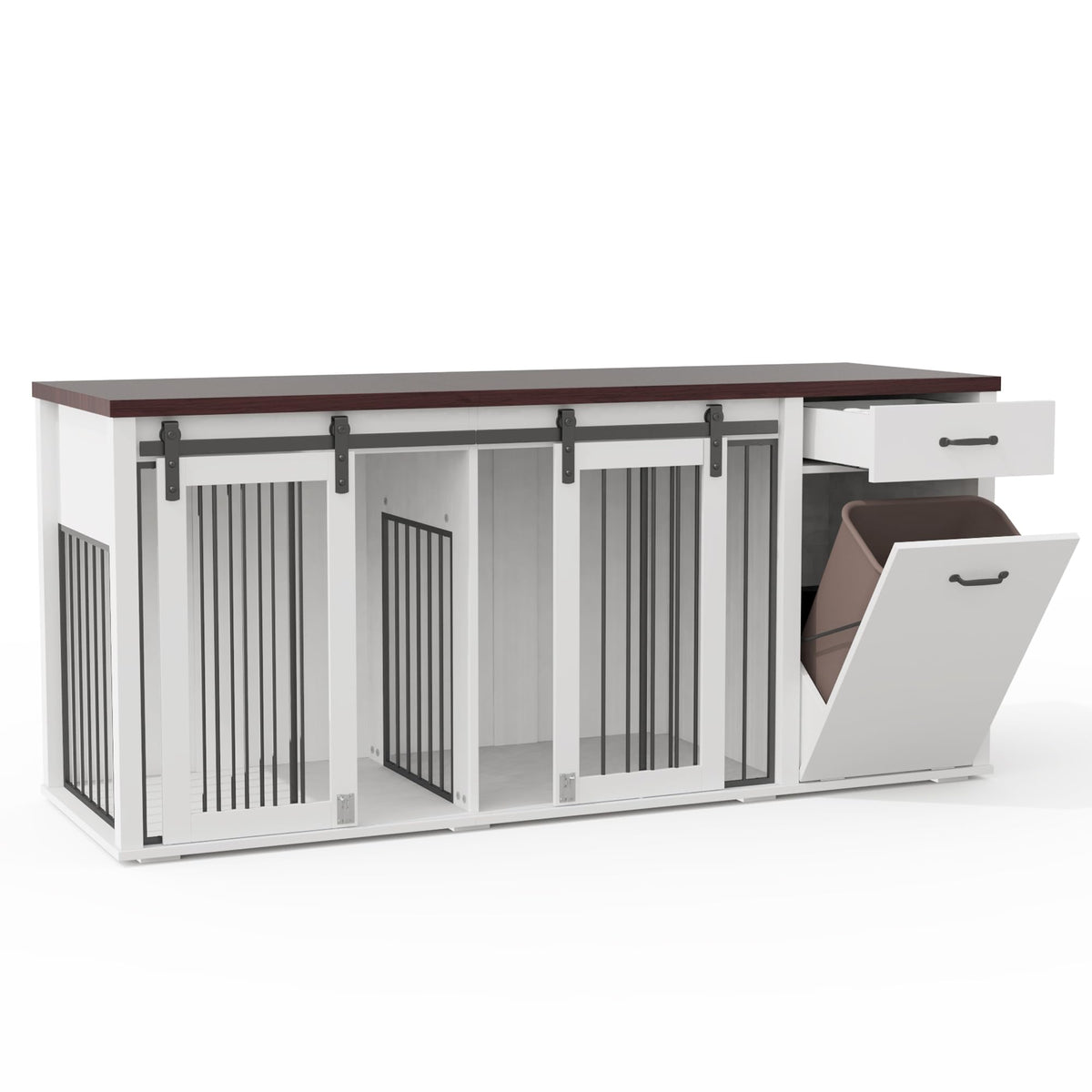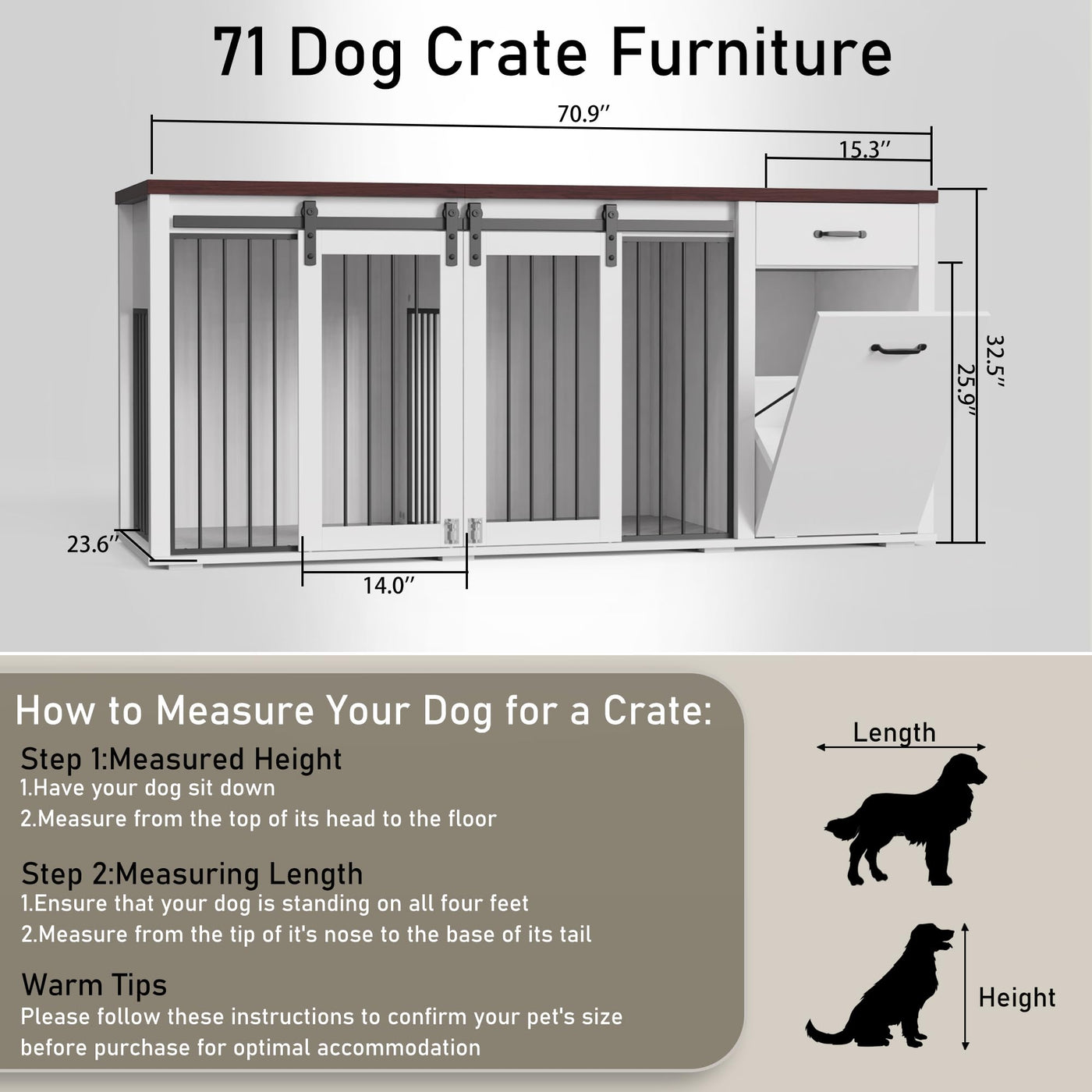 70.9 Large Dog Crate Furniture for 2 Dogs, Wooden Dog Wooden Dog Kennel with Drawer, Furniture Style Dog Crates, Decorative Dog Crate with Tilt Out Trash Cabinet, Divider and Sliding Barn Door