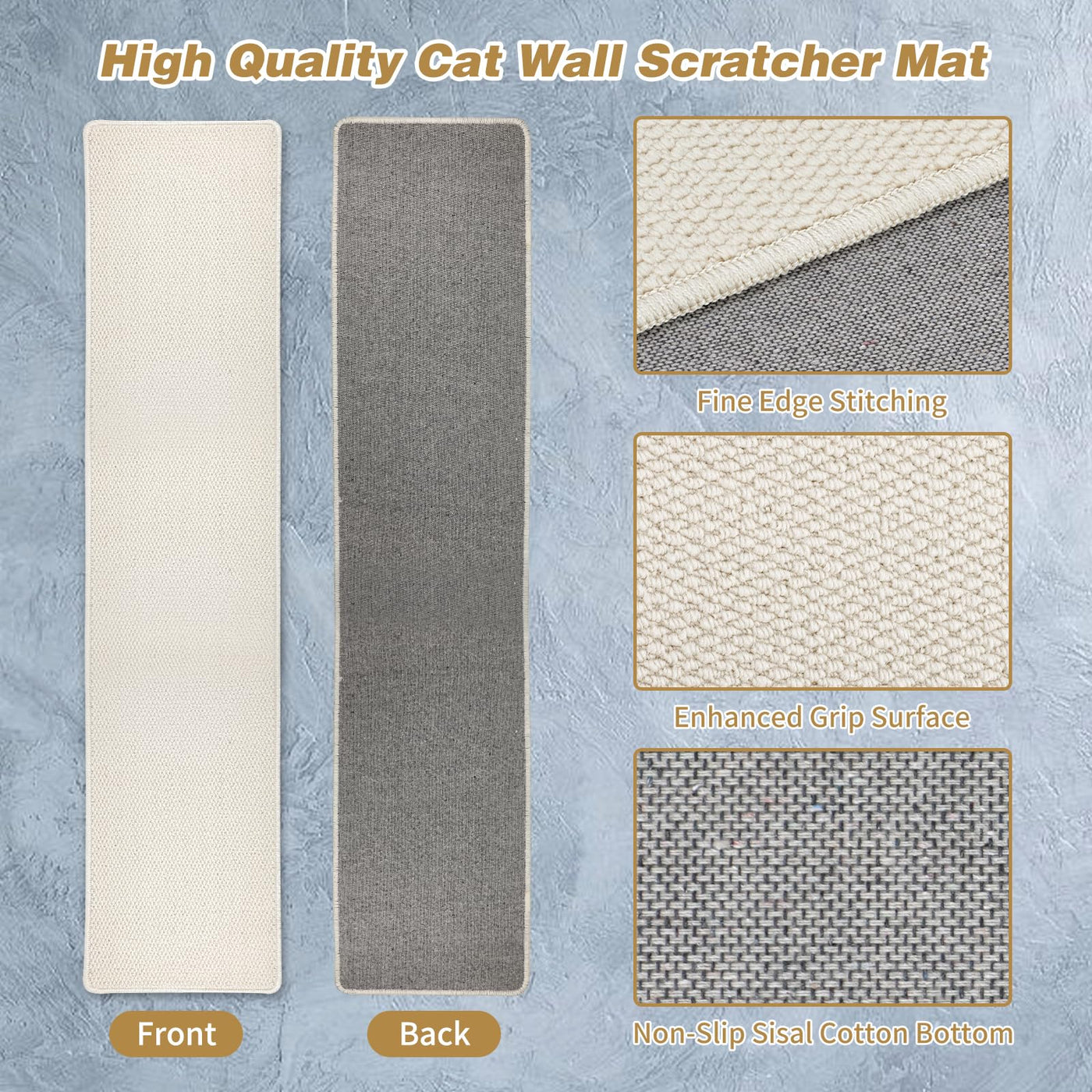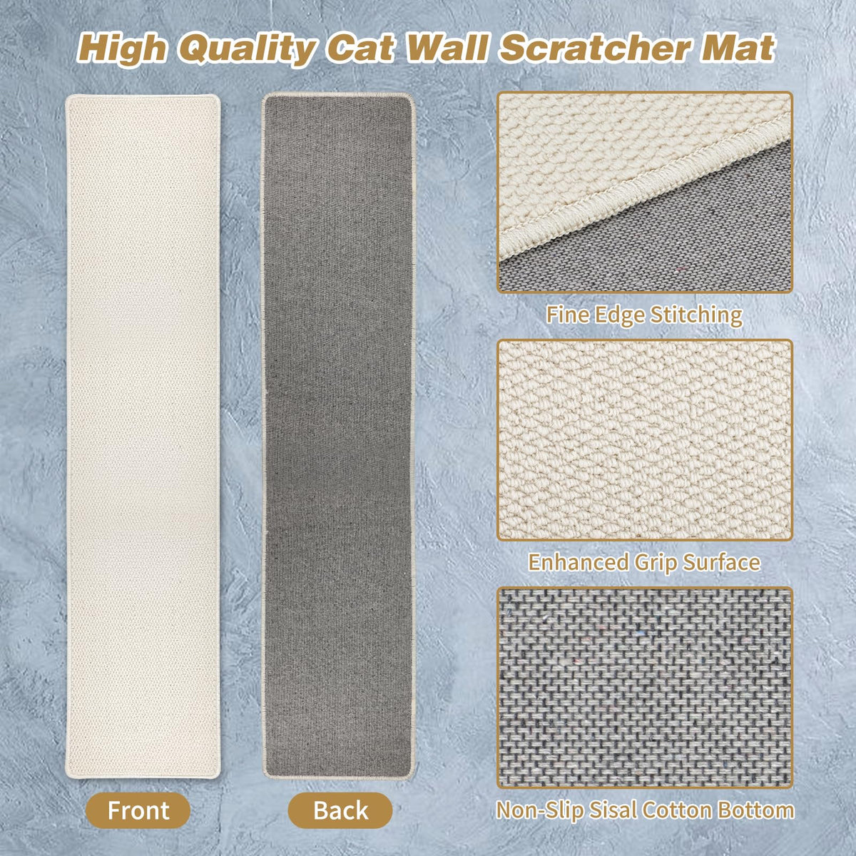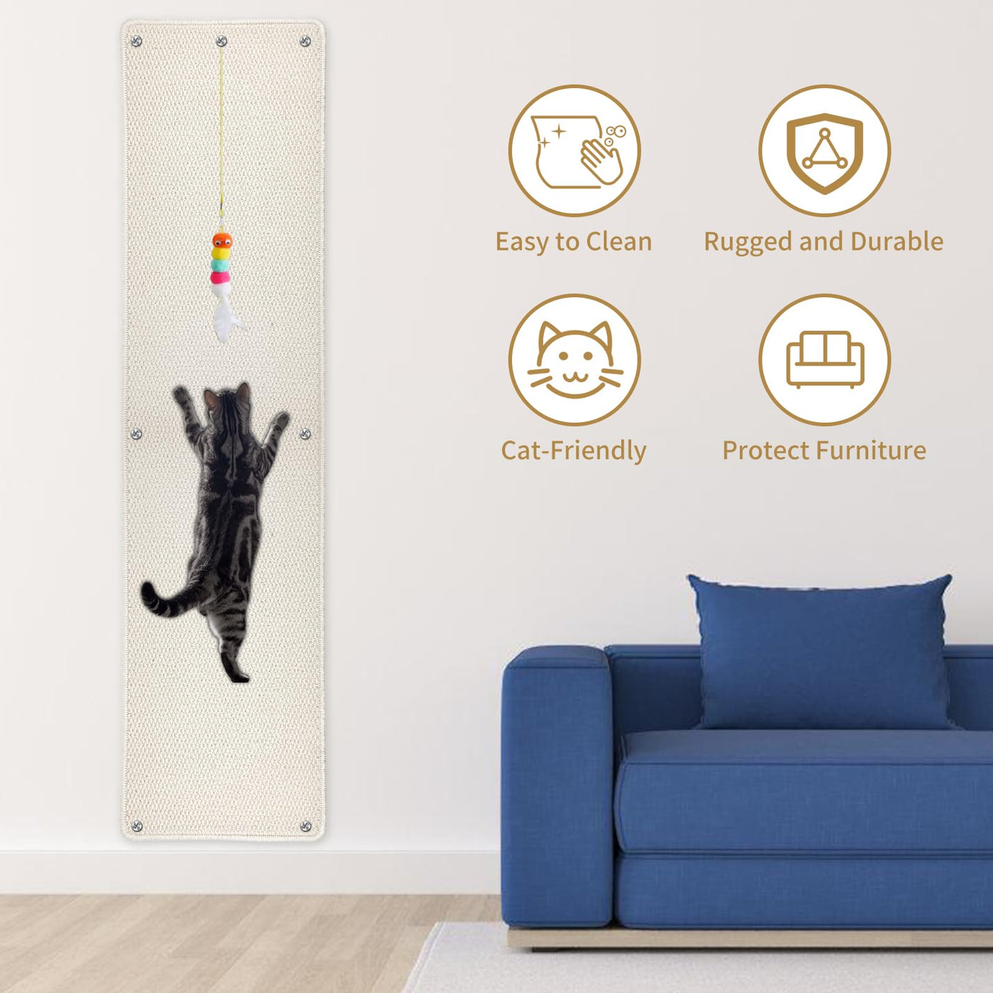 Claw Sharpening Is In The Nature Of Cats, Wall Mounted Cat Scratcher Can Provides A Comfortable Scratching Surface For Cats, Reduce Damage To Furniture By Diverting The Cat'S Attention To It Thickened Cat Wall Climbing Carpet Can Help Cats Build Muscle, Relieve Stress, And Release Excess Energy Wear-Resistant Material: Imitation Sisal Cat Wall Scratcher Mat Is Durable, Stain-Resistant And Easy To Clean Whilst Maintaining A Soft Stronger Fixing: Screws And Pieces Plastic Expansion Pipe Will Make The Installation More Firmly And Stably, Not Easy To Fall Off Product Size: 71''Length X 15.7''Width X 0.39'' Thick Packing List: 1 X Cat Scratch Wall Mat, 16 X Screws And 16 X Plastic Expansion Pipe