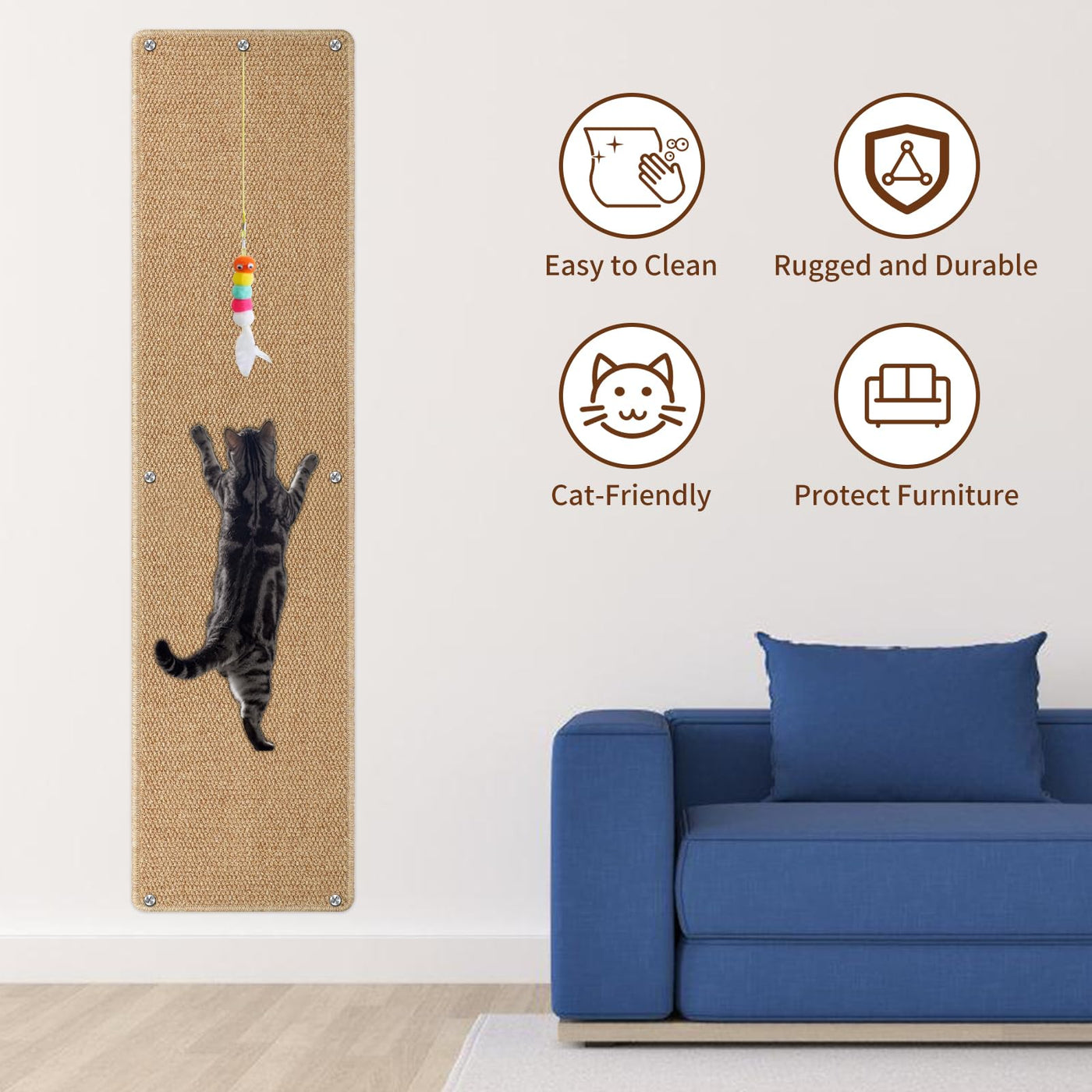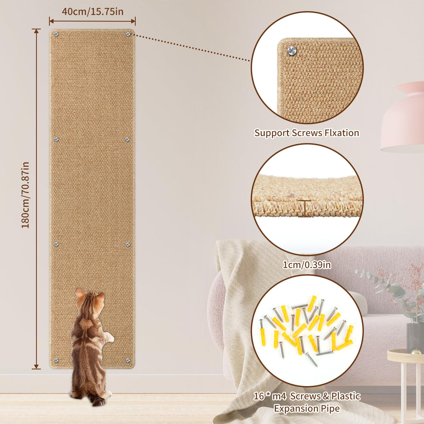 Claw Sharpening Is In The Nature Of Cats, Wall Mounted Cat Scratcher Can Provides A Comfortable Scratching Surface For Cats, Reduce Damage To Furniture By Diverting The Cat'S Attention To It Thickened Cat Wall Climbing Carpet Can Help Cats Build Muscle, Relieve Stress, And Release Excess Energy Wear-Resistant Material: Imitation Sisal Cat Wall Scratcher Mat Is Durable, Stain-Resistant And Easy To Clean Whilst Maintaining A Soft Stronger Fixing: Screws And Pieces Plastic Expansion Pipe Will Make The Installation More Firmly And Stably, Not Easy To Fall Off Product Size: 71''Length X 15.7''Width X 0.39'' Thick Packing List: 1 X Cat Scratch Wall Mat, 16 X Screws And 16 X Plastic Expansion Pipe
