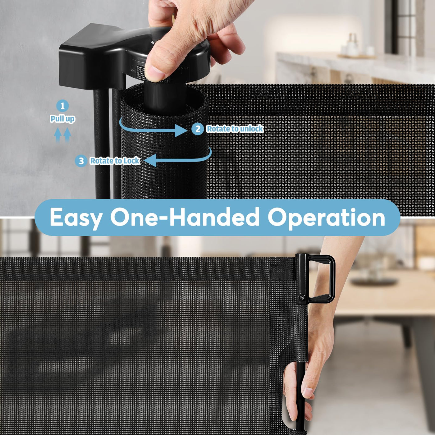 1. 75 Inch Long Baby Gate: KISKIZ retractable baby gates are up to 75 inches wide and 33 inches tall for wide openings. 2. Space-Saving: Our retractable baby gate retracts completely when not in use or when guests are visiting, saving space and allowing easy access. 3. No Tripping Hazard: The no-bottom-rail design eliminates tripping hazards. 4. Safety Lock: This retractable dog gate is designed with a safety lock mechanism. Once locked, the outdoor dog gate can be securely closed to prevent babies and pets from accidentally opening it. 5. Easy One-Hand Operation: Our extra wide baby gate has a one-handed operation design, making it easy for adults to open the gate for easy access. 6. Adjustable Parts - Fits Any Baseboard: The lower bracket of the wide retractable gate slides up and down to adjust to different heights of the baseboard. 7. Easy Installation: This large baby gate comes with all the mounting hardware to make installation easier and more secure once installed. 8. Durable & Scratch-Resistant Soft Mesh: Our mesh baby gate is made of soft and durable anti-scratch mesh that can withstand pet paws and prevent injuries to children and pets when they accidentally bump into the retractable gates for dogs. 9. Perfect for Indoor and Outdoor Use: Our outdoor baby gates for decks are not only perfect for indoor doorways, hallways and stairs, but also for outdoor areas such as decks, patios and porches, garages, etc. 10. Standards Approved: Our retractable baby gates extra wide have been tested to safety standards and meets or exceeds ASTM and EM standards.