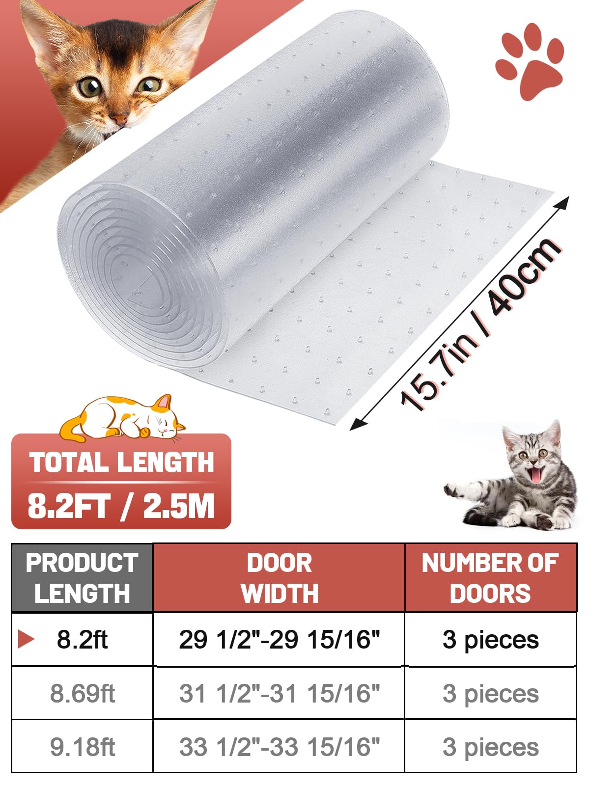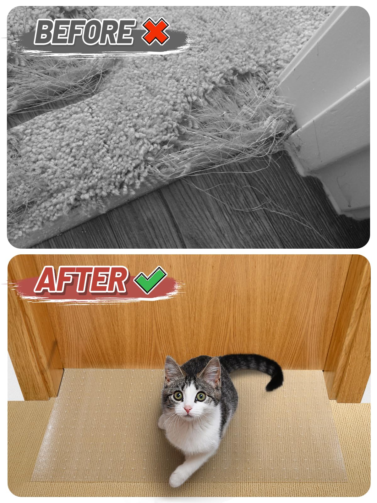 Q: How does the 8.2Ft Cat Carpet Protector prevent scratching and tearing?A: The 8.2Ft Cat Carpet Protector is designed to stop destructive behavior by covering rugs around doorways. Made of durable, wear-resistant PVC plastic, it protects carpets from scratches and tears caused by your cat's claws.