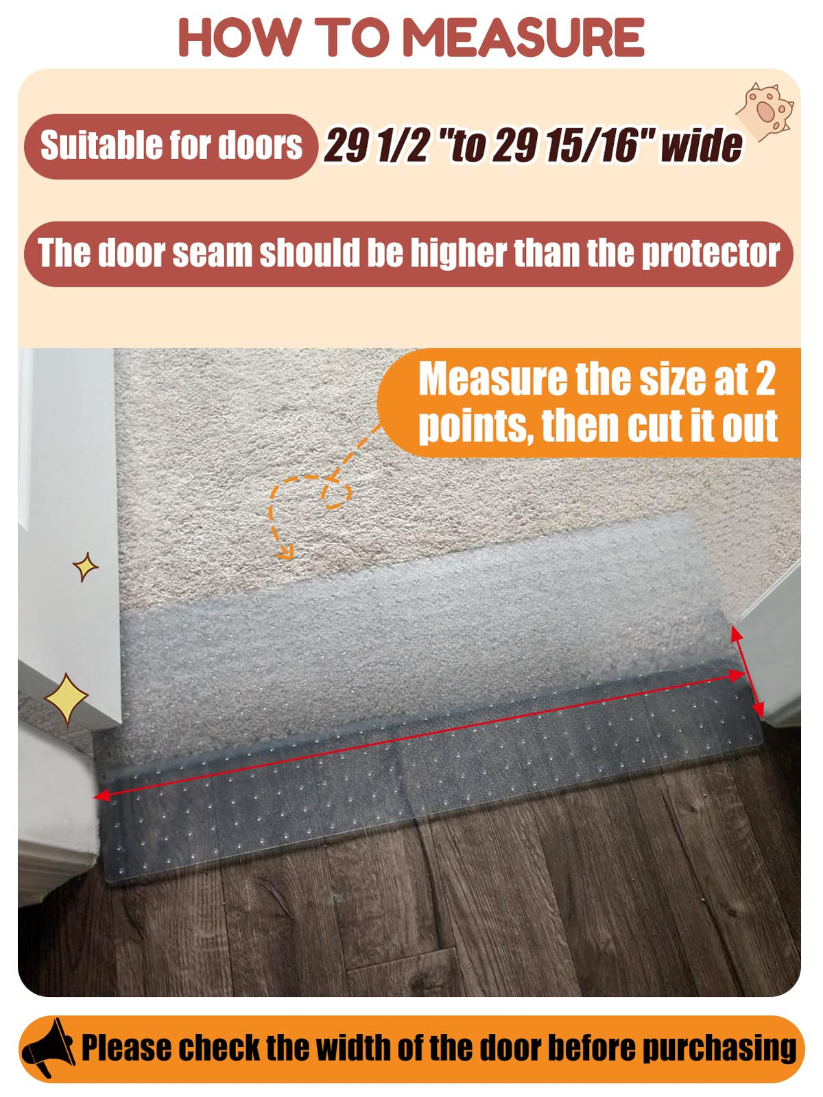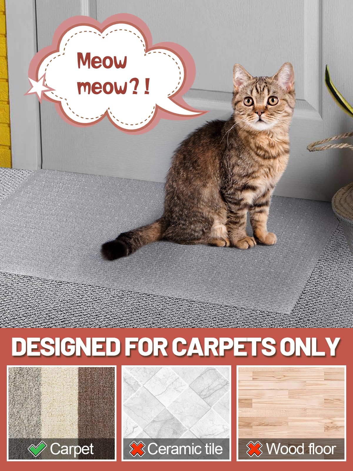 Do You Want To Save The Carpet From The Cat 'S Paws? Do You Want To Protect Your Carpet From Scratches And Tears? This Pets Scratch Stopper For Carpet Keeps Your Rugs In Better Condition. Features Wear-Resisting This Carpet Protector Is Made Of High-Quality Recyclable Pvc Plastic. Even If The Cat Shows Its Sharp Claws, It Will Not Cut It. Non-Slip Carpet Protectors Have Many Back Nails. It Fits Well With The Carpet. Suitable Size 8.2-Foot Plastic Floor Runner Can Be Cut To At Least 3 Carpet Protectors. You Could Cut It According To The Doorway 'S Size To Avoid Improper Size. Tips Please Measure The Width Of The Doorway Before Purchasing. Press Heavy Objects On The Carpet Protector For Several Hours To Make It Flatter. Product Specifications Material: Plastic Color: Transparent Size: 12 Inches X 8.2 Feet Package: 1 Roll Of Cat Carpet Protector