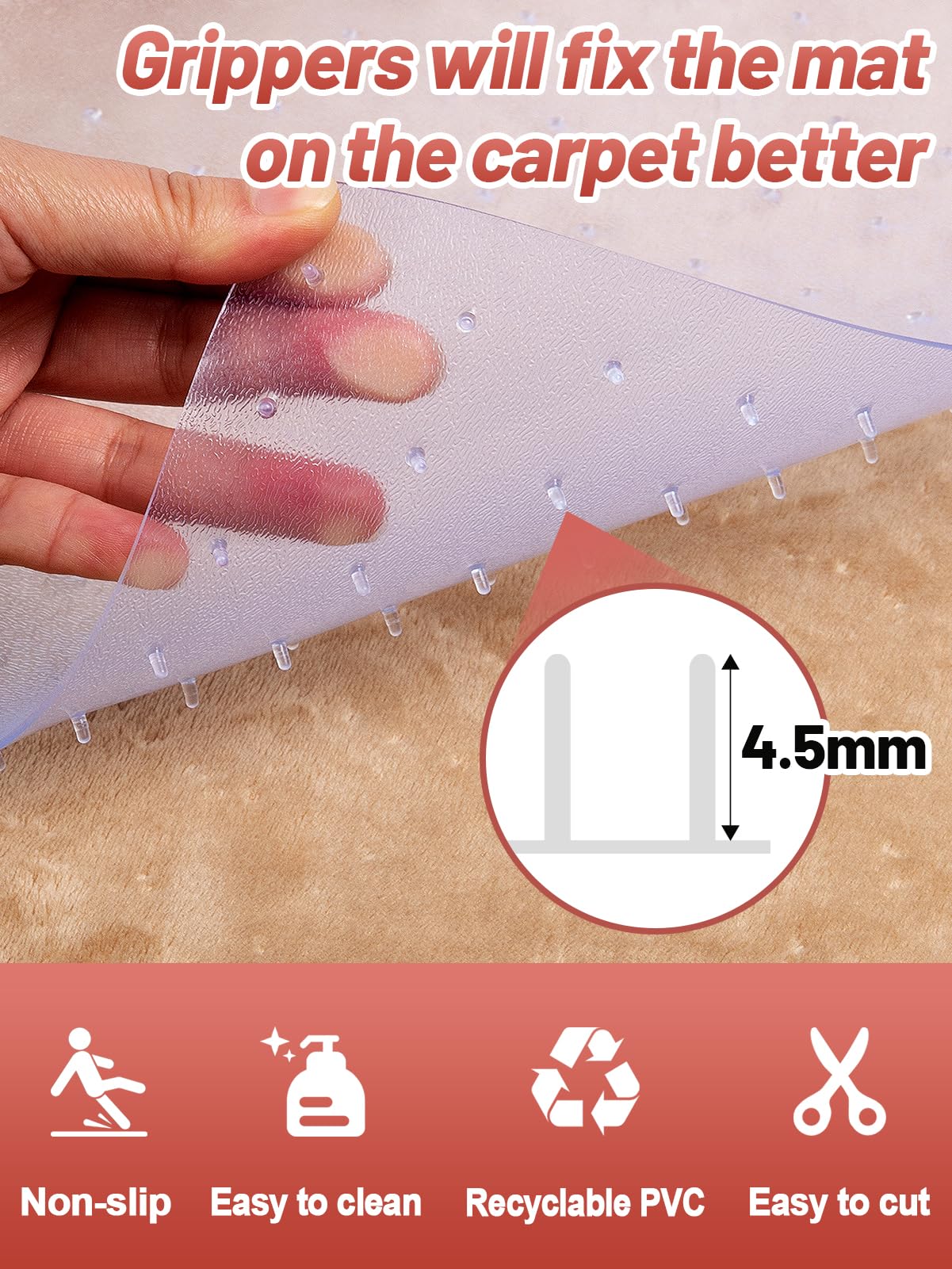 Q: Is the carpet protector non-slip?A: Yes, the carpet protector features numerous 0.2-inch (5mm) nails on the back that help it adhere closely to the carpet, preventing it from moving. This non-slip design also ensures safety for both pets and humans.