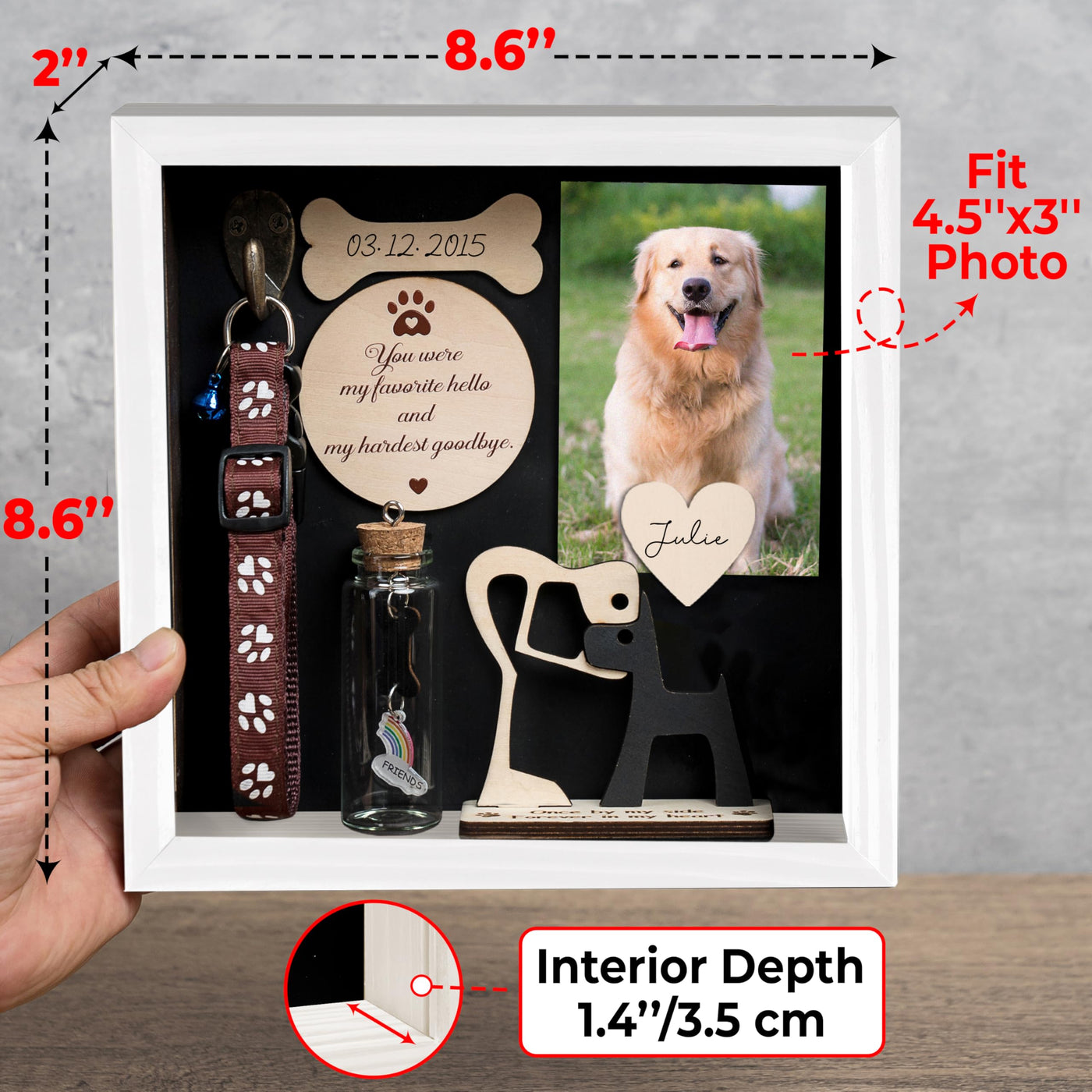 8.6'' Pet Memorial Shadow Box Gift Collar Holder Picture Frame With Paw Print Ink Kit Rainbow Bridge Fur Urns Bottle Sympathy Pet Sculptures Passing Away Dog Cat Gifts Tabletop Wall Decor Psd-4W Specifications: + Shape: Square + Sizes: 8.6''X8.6 + Thickness: 2'' + Interior Depth: 1.4'' Material: Wood And Acrylic Beautiful Patterns, Durable Construction, Smooth Edges, And Lightweight Design Package Included: + 1 Shadow Box Comes With 1 Collar Holder + 1 Acrylic Cover + 1 Fur Jar + 1 Pet Sculptures + 1 Quote Ornament + 2 Handwritten Tags + 1 Pen + 1 Giftable Box Features: This Pet Keepsake Is A Heartfelt Way For Pet Owners To Cherish Their Beloved Furry Friends. This Keepsake Box Symbolizes Love And Loyalty, Allowing Pet Lovers To Hold Onto A Piece Of Their Pet Even After They Have Passed. Crafted From High-Quality Wood And Durable Materials, This Keepsake Is Designed To Last A Lifetime. The Elegant Design Adds A Touch Of Sophistication, Making It A Beautiful Addition To Any Home Decor. This Pet Keepsake Makes A Thoughtful And Sentimental Gift For Any Animal Lover. It Is Perfect For Occasions Such As Pet Memorials, Birthdays, Or Holidays, Allowing Friends And Family To Express Love. Important Notes: Please Allow Slight Errors In Size Due To Manual Measurement The Color May Appear Slightly Different Due To Variations In Lighting.