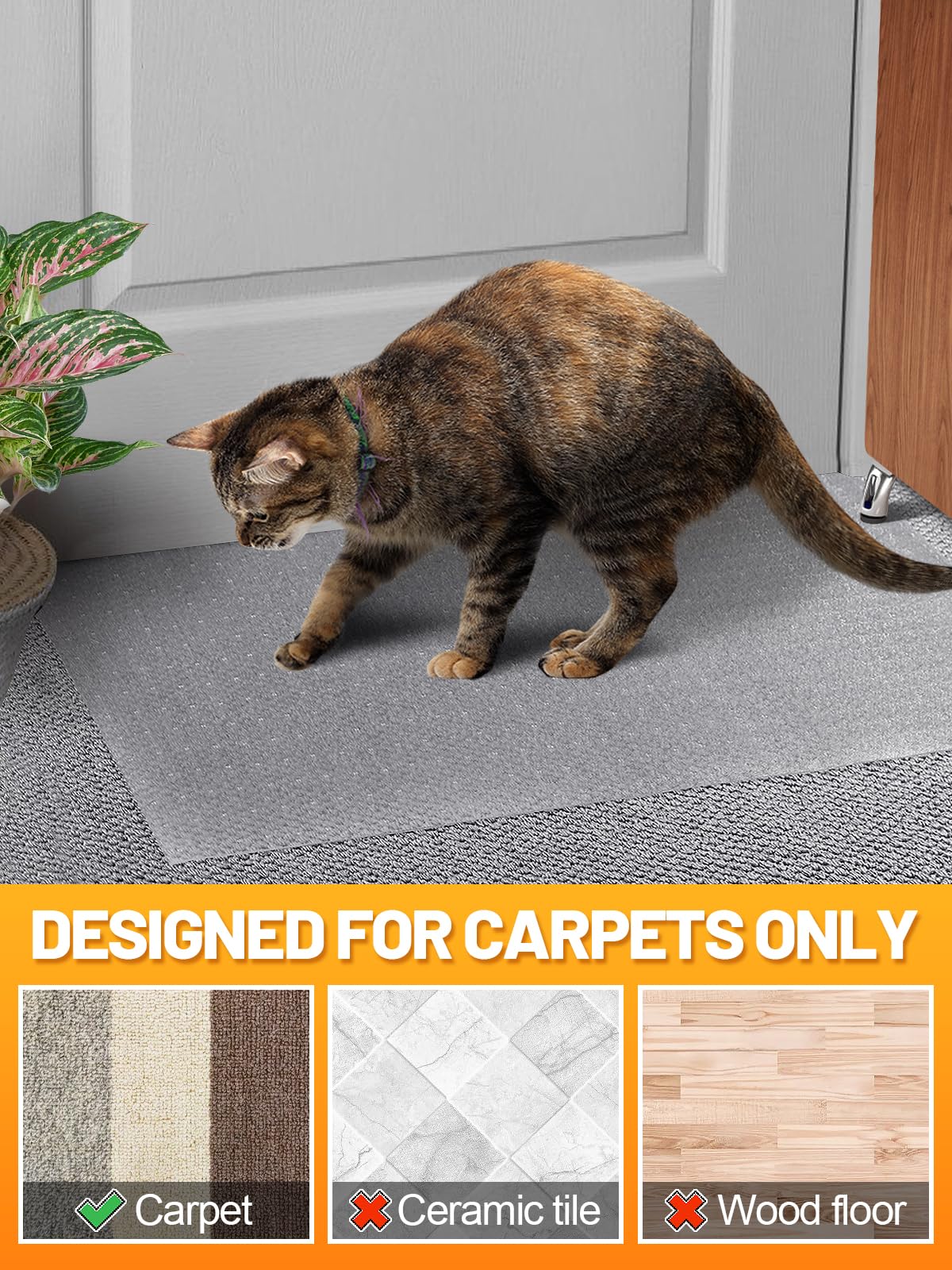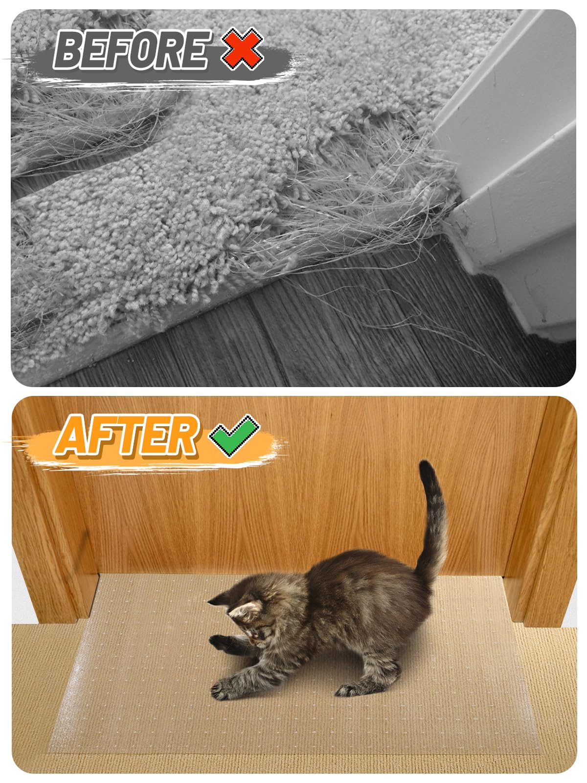 Q: Is the carpet protector safe for my pets?A: Yes, the carpet protector is made of high-quality, durable, and recyclable PVC plastic that is safe for pets. The non-slip design and flat surface ensure it won't harm your cat's paws while effectively preventing scratching and tearing.