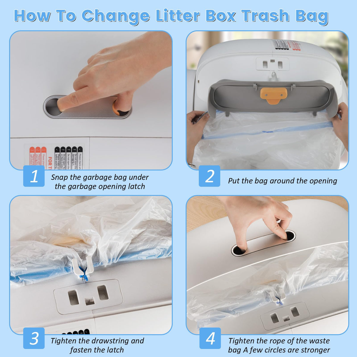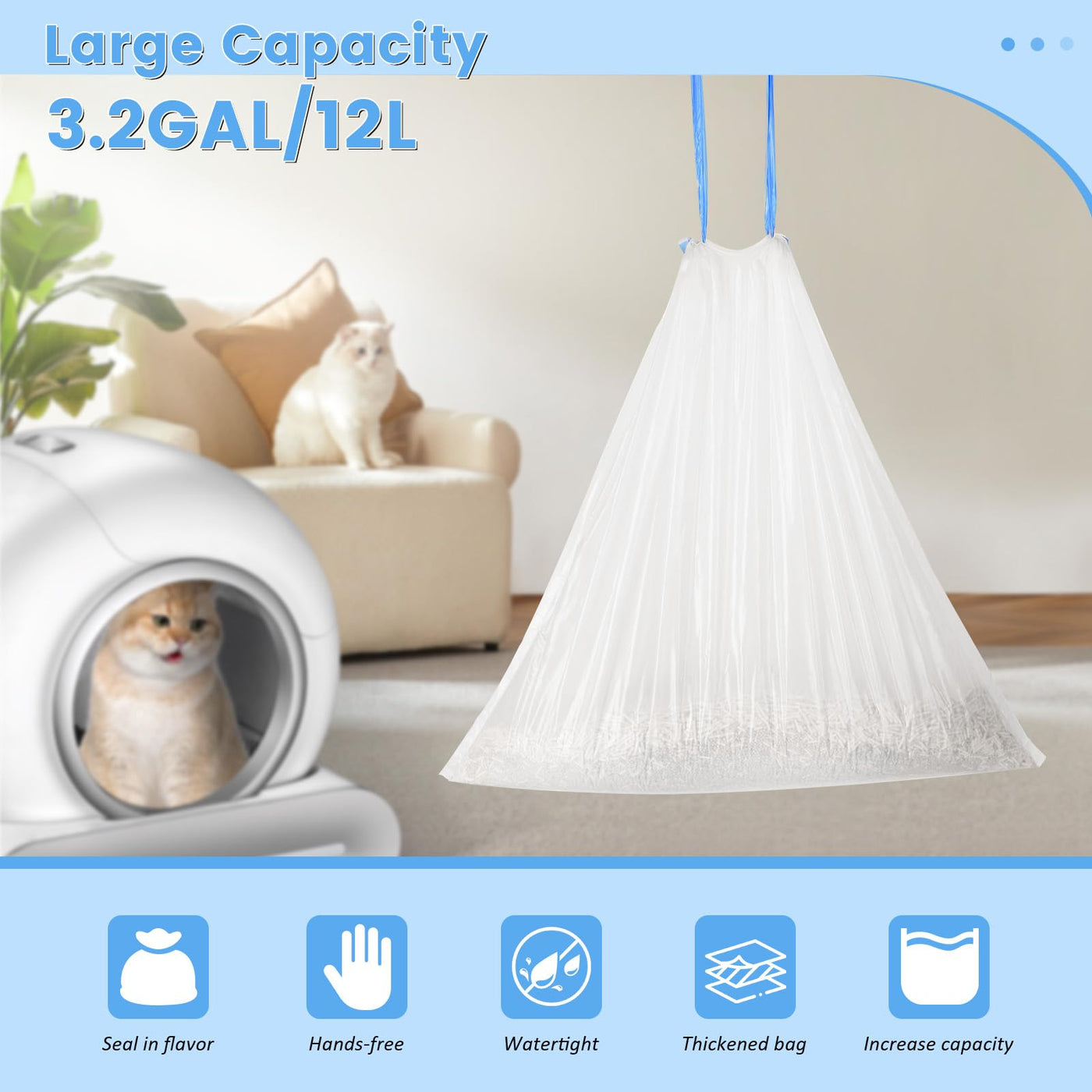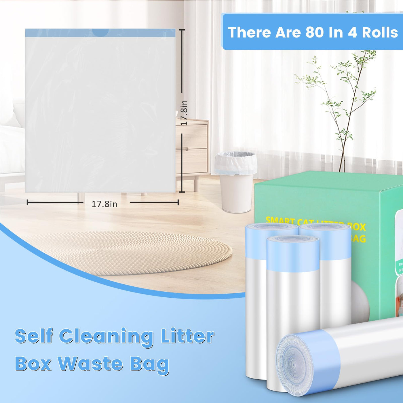 ?18.2 X 18.2 Inches? This Cat Litter Bag Is Only Suitable For Small-Caliber Self-Cleaning Cat Litter Boxes, And Cannot Be Used For Ordinary Cat Litter Boxes. In Addition, It Is Suitable For Collecting Other Garbage, Such As Kitchen Garbage, Bathroom Garbage And So On ?80 Counts/4 Rolls? There Are 4 Rolls Of Cat Litter Bags In A Box, A Total Of 80. If You Change It Twice A Week, It Will Last Ten Months! ?Thicker And Stronger? This Cat Litter Bag Is Specially Designed For Cat Litter. The Thickened Material Can Effectively Prevent Cat Litter From Scratching The Cat Litter Bag, And Can Prevent Liquid From Leaking 100% ?Drawstring Bags? The Rope-Drawing Cat Litter Bag Can Be Suitable For Many Scenes, And It Is Convenient Enough In The Process Of Throwing Garbage. ?Odour Removal? The Waste Collection Box Is A Separate Module Designed To Isolate Odors, And The Device Uses Negative Ion Technology To Neutralize Odors, Ensuring The Indoor Air Remains Fresh. All Parts Inside The Machine Are Easily Removable For Hassle-Free Cleaning