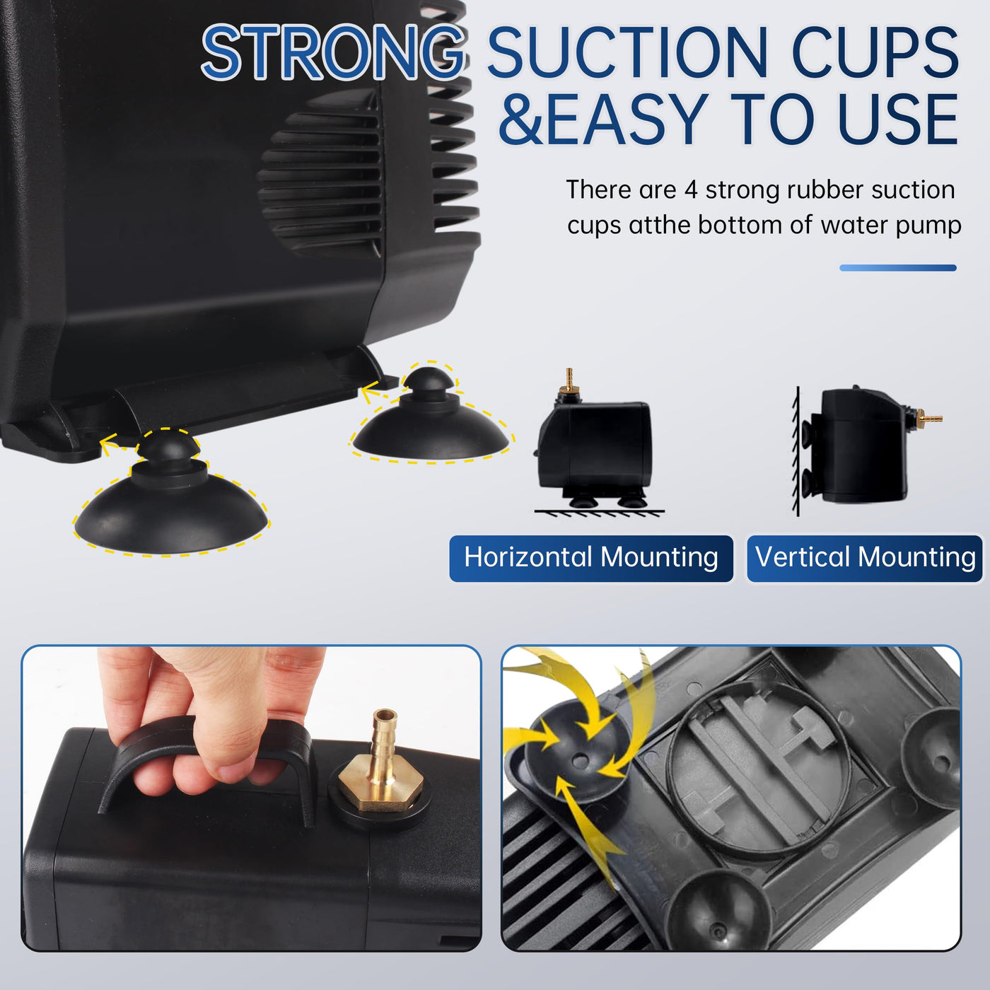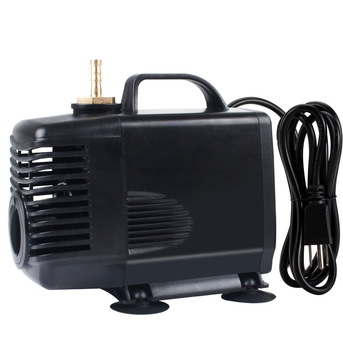 This submersible water pump is great for aquarium fountains spout and hydroponic systems. Adjustable water flow rate; Suction cup mounting feet for either vertical or horizontal mounting.Contains no seals or messy oils.