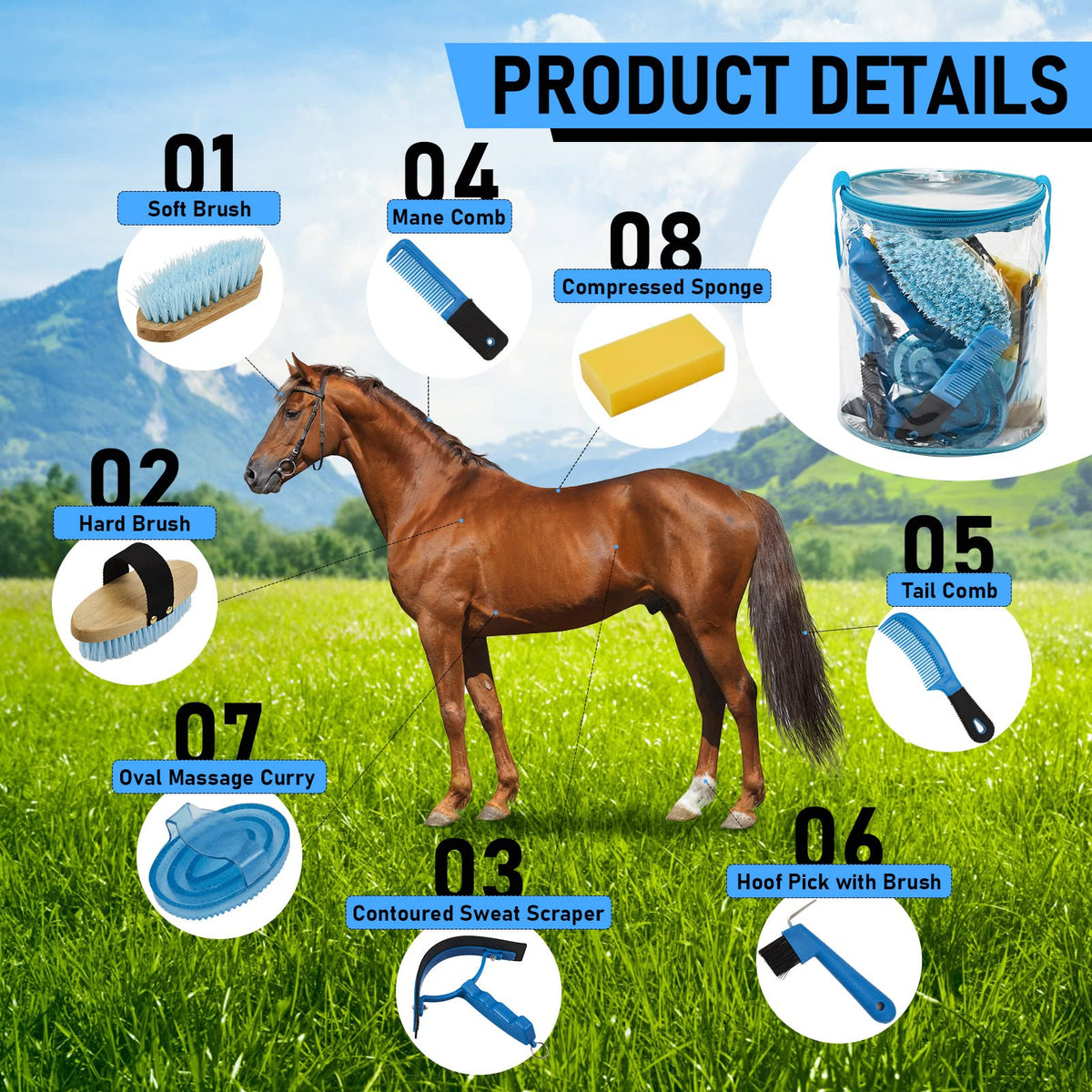 9 Pieces Horse Grooming Kit Tack Room Supplies Set With Organizer Tote Bag, Oval Massage Curry, Hard And Soft Brush, Hoof Pick,
