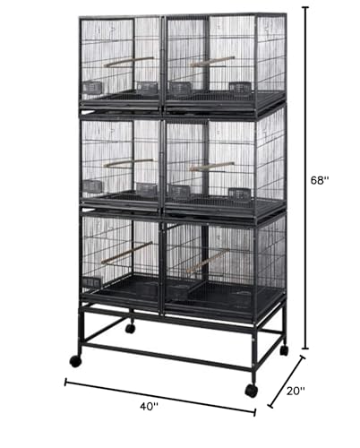 Technical Details & Product Features, Exterior Dimensions: 40'x20'x68', Interior Height: 18', Bar Spacing: 1/2', 3 removable dividers for up to 6 separate cages, Large central door on each cage, Small swing-out front doors, Removable grates and trays for easy cleaning, 2 feeder dishes with their own doors in each cage, 4 easy rolling casters, Non-toxic, durable and safe powder coated finish