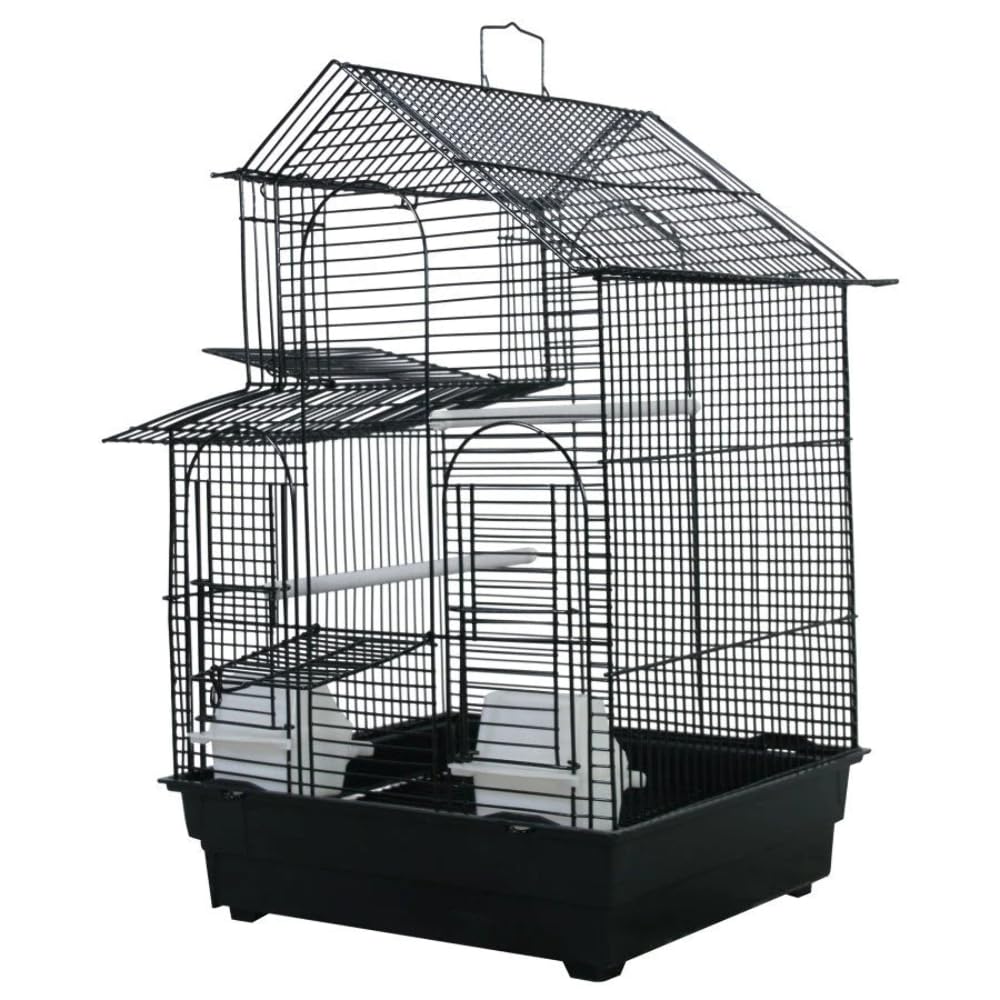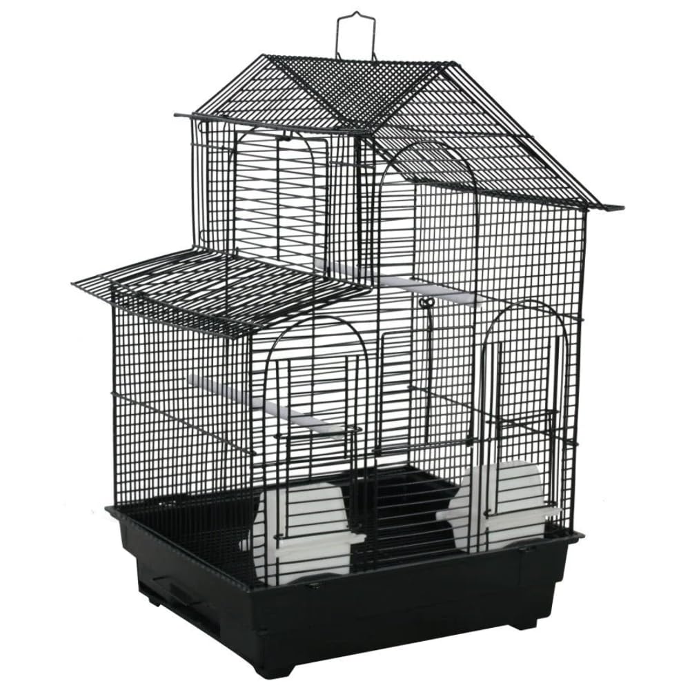 Q: What materials are used in the construction of this birdcage?A: The A&E Cage Company Cage House is made of welded steel bars with a non-toxic powder coat finish, ensuring safety and durability for your feathered friends.
