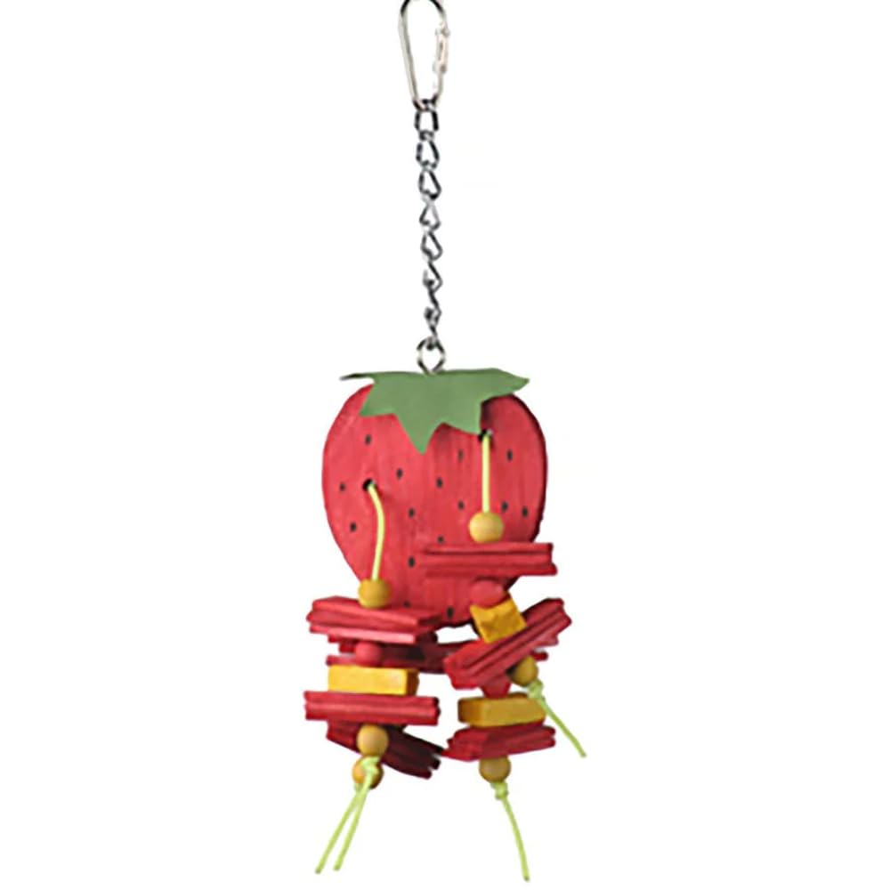 Q: What materials are used in the A&E Cage Company Toy Hbk Strawberry Sm?A: While specific material details are not mentioned, A&E Cage Company focuses on non-toxic finishes and safe designs for bird toys.