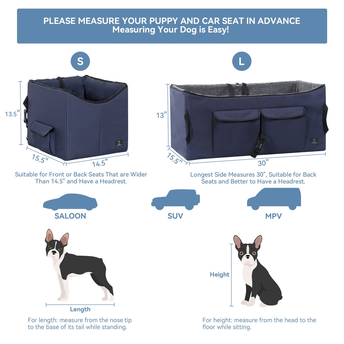 Perfect Fit for Large & Medium Dogs: Measures 30'L x 15.5'W x 13'H, designed for dogs up to 55 lbs or two small dogs. Fits comfortably in the back seat of most cars. Easy to assemble for hassle-free setup. | Reversible & Removable Cover: Features a plush side for winter and a high-quality Oxford cloth side for summer. The cover is removable and washable, ensuring easy maintenance and a clean, comfortable ride for your pet. | Enhanced Comfort & Support: Comes with a removable double-sided cushion and a sturdy frame with a built-in support plate. This design elevates your dog for a better view during trips, enhancing their travel experience. | Secure & Safe: Equipped with 2 detachable, adjustable safety leashes that can be buckled to the headrest and seat belt, plus tethers for collar attachment. Keeps your dogs secure and stable in the large dog car seat. | Convenient & Portable: Foldable design with a carrying case for easy transport and storage. Includes storage pockets for your pet's essentials. Can also be used as a cozy dog bed for indoor use. | 1-Year Warranty: Comes with a 1-year warranty for peace of mind, ensuring you and your pet enjoy many safe and comfortable journeys together.