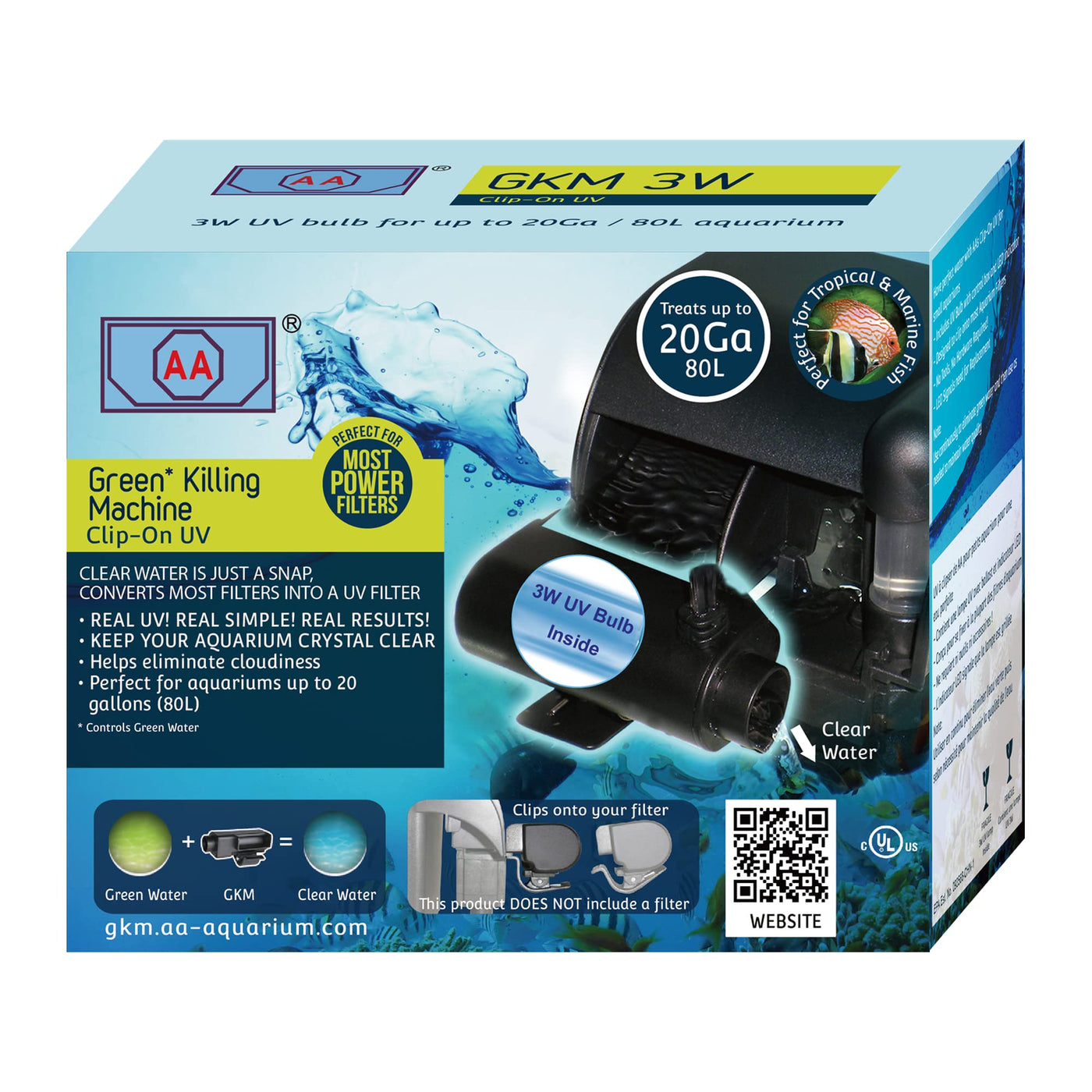 gKM3W clip-On UV For aquariums up to 20 gallons The gKM3W clip On UV allows water flow in direct contact with the UV lamp making it extremely efficient Keep your aquarium crystal clear & reduce water changes Simply clip On to your filter converts most filters into a UV Filter Leave running 247 for the first 2 weeks Works best with hang-on filters that have a flat or near flat water outlet 2 inches (55cm) wide or wider May not work well with a filter with a curved water outlet LED signals need for replacement UV bulbs lasts for 6 to 9 months assuming constant use Sealed UV bulb design Once your water is clear for a full week Use your clip On UV System as need to maintain perfect clarity UL listed EPA Est # 093568 comes with UL plug only suitable for US market