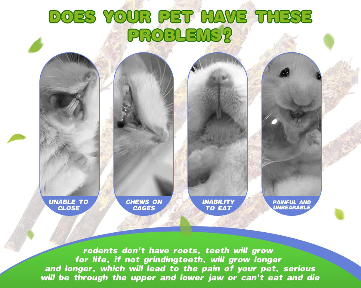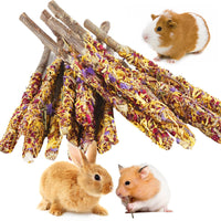 ?VISIBLE FLOWER &GRASS PETALS?All the flower and grass petals are carefully selected by us, and the high-temperature drying technology achieves nutrition while ensuring the safety of pets. ?ORGANIC AND HEALTHY TREATS FOR RABBITS?Organic ingredients: Pink Rose Petals, Calendula, Chamomile, Lavender with Apple Stick (Natural apple tree branches to ensure the healthy growth of small pet teeth, perfect for Chinchillas, hamsters, rabbits, guinea pigs, gerbils, bird and other furry animal) ?18 STICKS IN A WHOLE PACK ?Vacuum-packed separately, there are 3 packs of vacuum-packed bags in the whole bag, including 6 mixed petal apple branches, better storage, always give rabbits fresh teething toy snacks and you save $$. ?KEEP RABBITS BUSY?Natural teething toys, so that pets can relieve stress and grind their teeth at the same time ?UNIQUELY HANDMADE? All treats are uniquely handmade and may vary slightly in picture If for some reason you are not satisfied with our Rabbit Chew toys ,we guarantee hassle free full refund, contact us if you have any questiones.