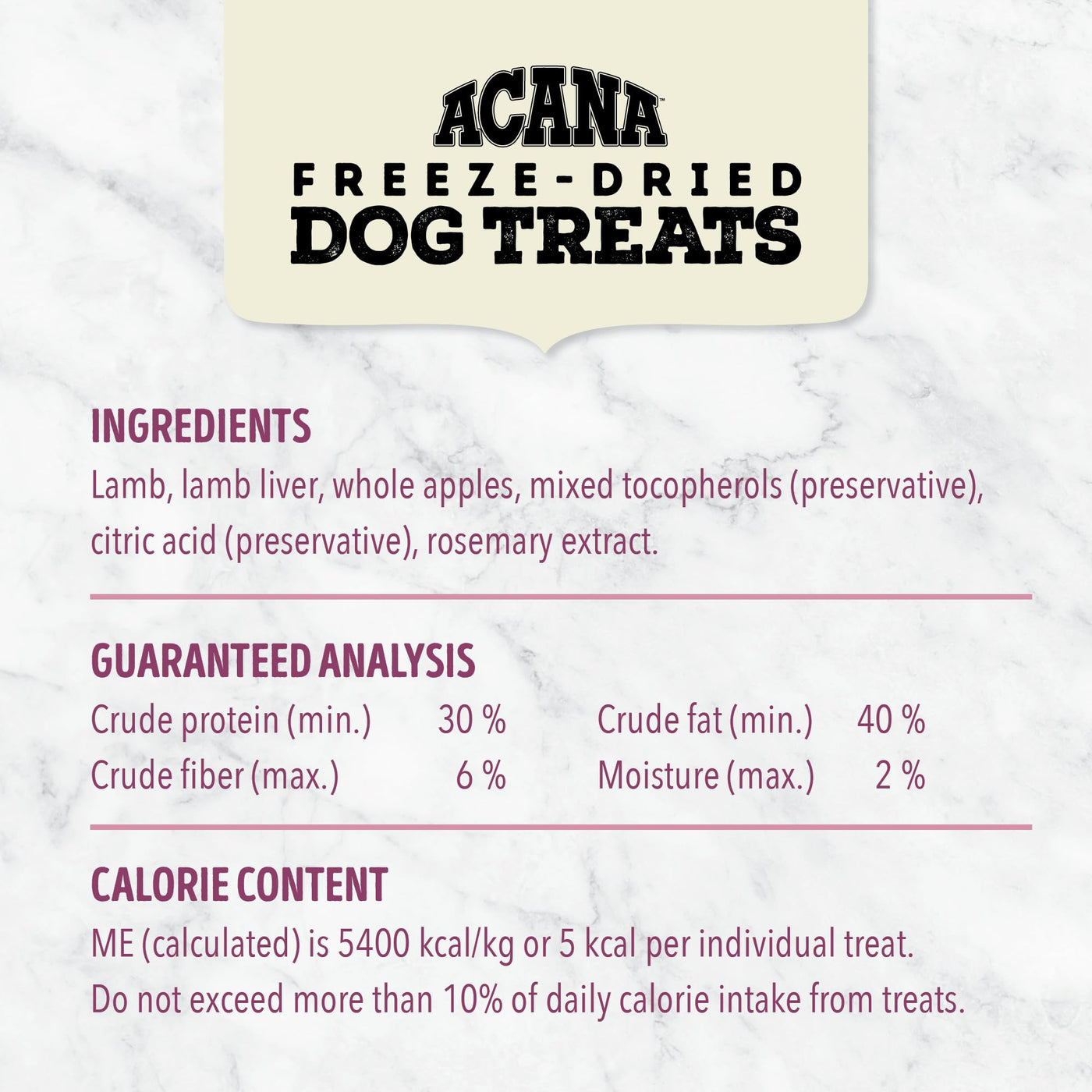 Reward your dog with the simple ingredients and craveable taste found in ACANA Singles Lamb and Apple Recipe Freeze Dried Dog Treats. At just 5 calories per dog treat and crafted with protein from a single animal source, these grain free* dog treats are loaded with goodness and perfect for training, making them a nutritious and tasty choice for picky pups. These high protein dog treats are made with just 3 simple ingredients** including nourishing lamb, lamb liver and delicious whole apples so you can feel good about making them part of your dogs daily routine. Gently freeze-dried to lock in protein-rich flavor, these dog treats will have your dog drooling as soon as they see the bag. Choose ACANA dog treats to give your companion the nutritional foundation they need to live a happy, healthy life. *Produced in a facility that also processes grains**Plus natural preservatives and flavors