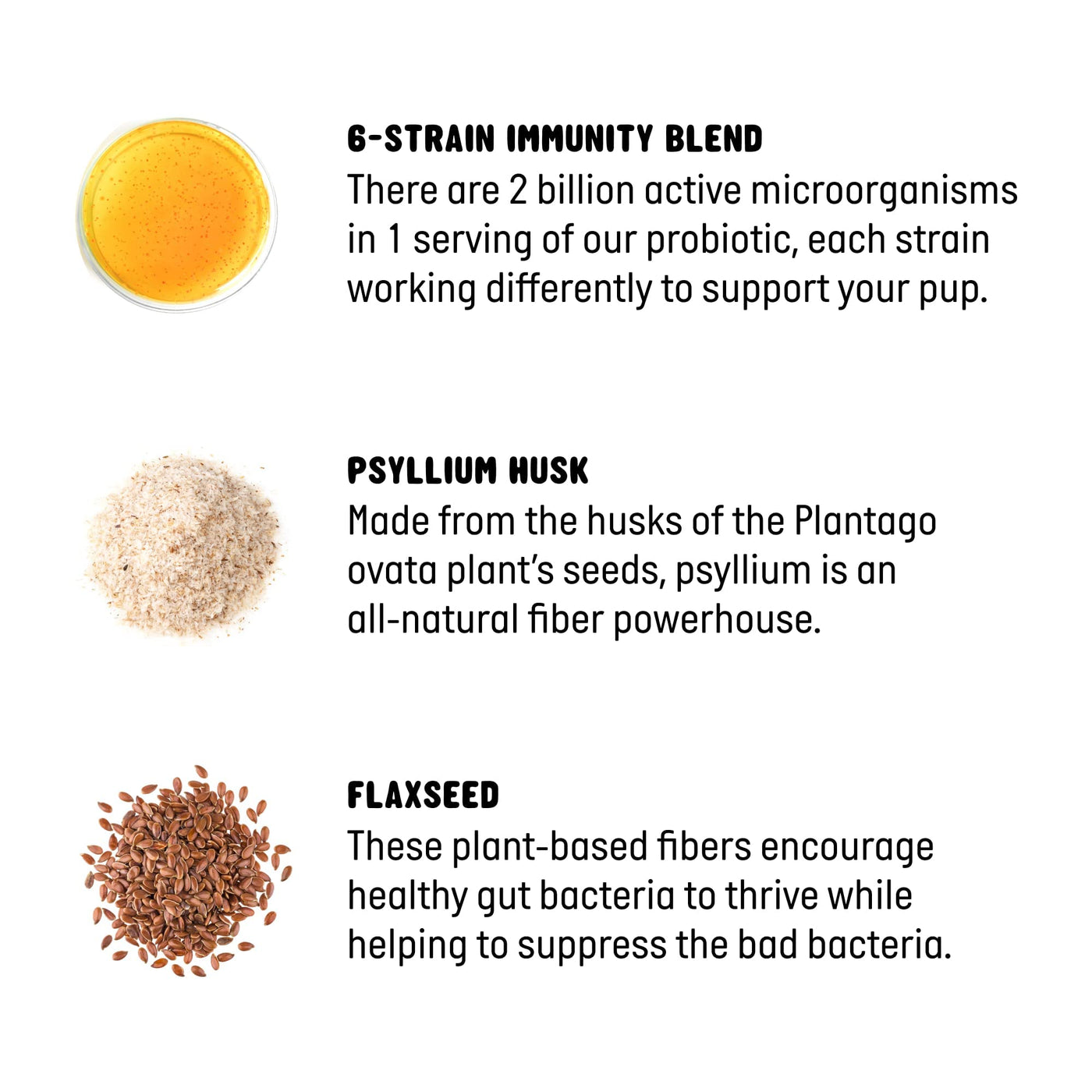 Your furry friend deserves the best. Thats why our dog supplements are filled with the highest quality ingredients and made right here in the USA. Our dog chews for gut health pack a fiber-filled punch, so bathroom time is a breeze. Active Chews dog probiotics feature six strings of bacteria (the good kind!) along with prebiotics, which helps create a healthy environment where gut flora can flourish. Psyllium Husk is full of fiber, so it can help ease constipation and promote bathroom regularity. Plus, our no-cook formula maintains the integrity of the ingredients, so you get 100% quality, every single time.