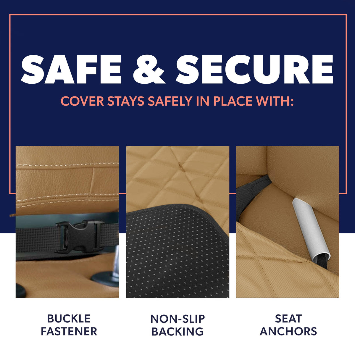 Q: What safety features does this seat cover provide?A: The seat cover includes multiple safety features such as heavy-duty buckles for the headrest and backrest, a seat anchor, and a non-slip bottom to ensure your pet stays secure while traveling.