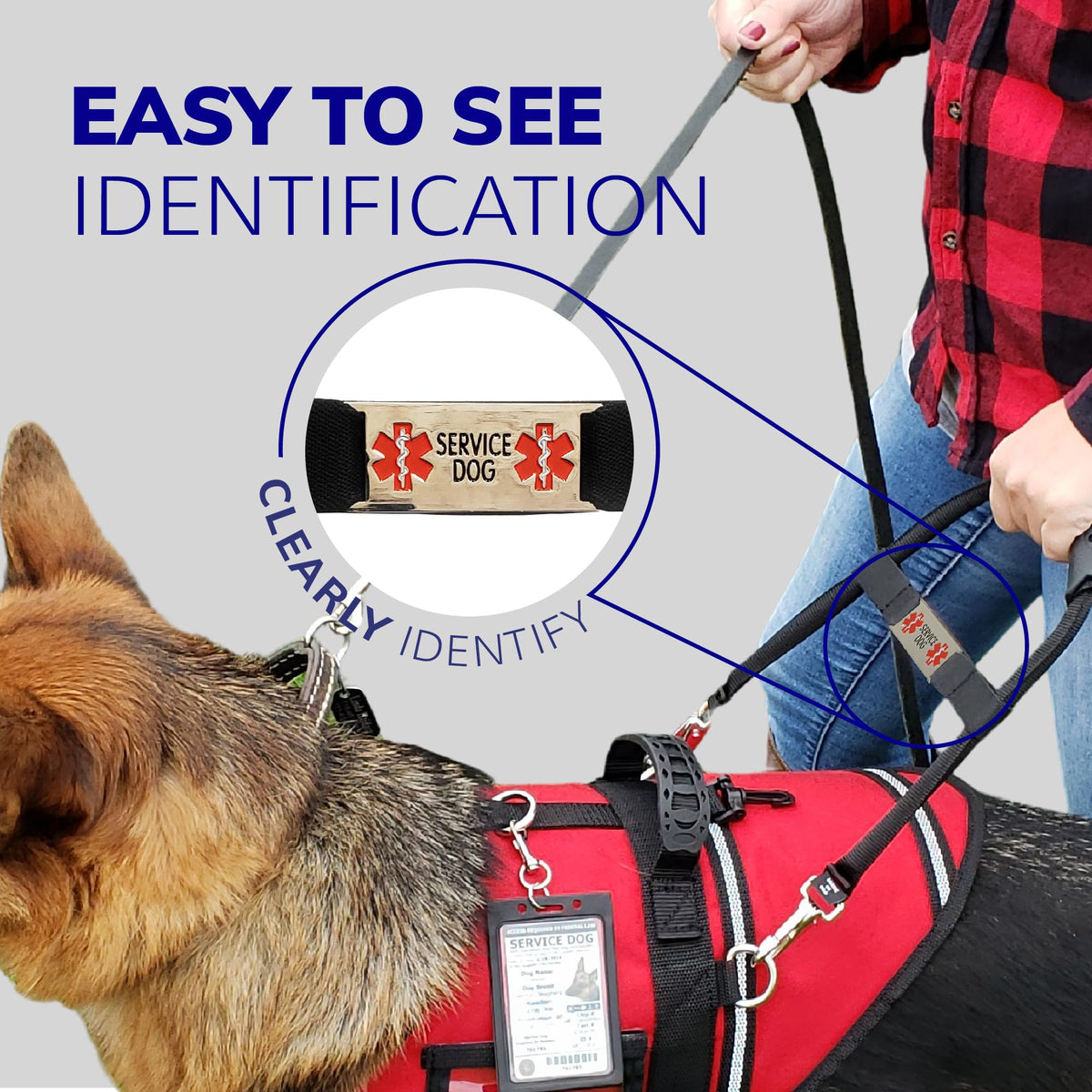 Q: Can the chrome ID band be adjusted or removed?A: Yes, the adjustable chrome ID band is removable and engraved with 'Service Dog' for clear identification. It also comes with two insignias to enhance professional recognition.
