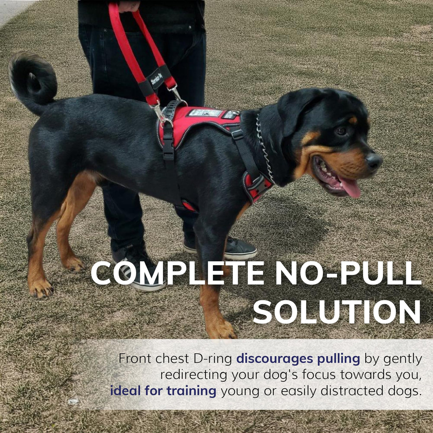 Q: How does the no-pull harness work for training my dog?A: The no-pull feature of this harness includes a front D-ring that discourages pulling by turning your dog back towards you. This design helps in effectively managing strong pullers during walks and training sessions.