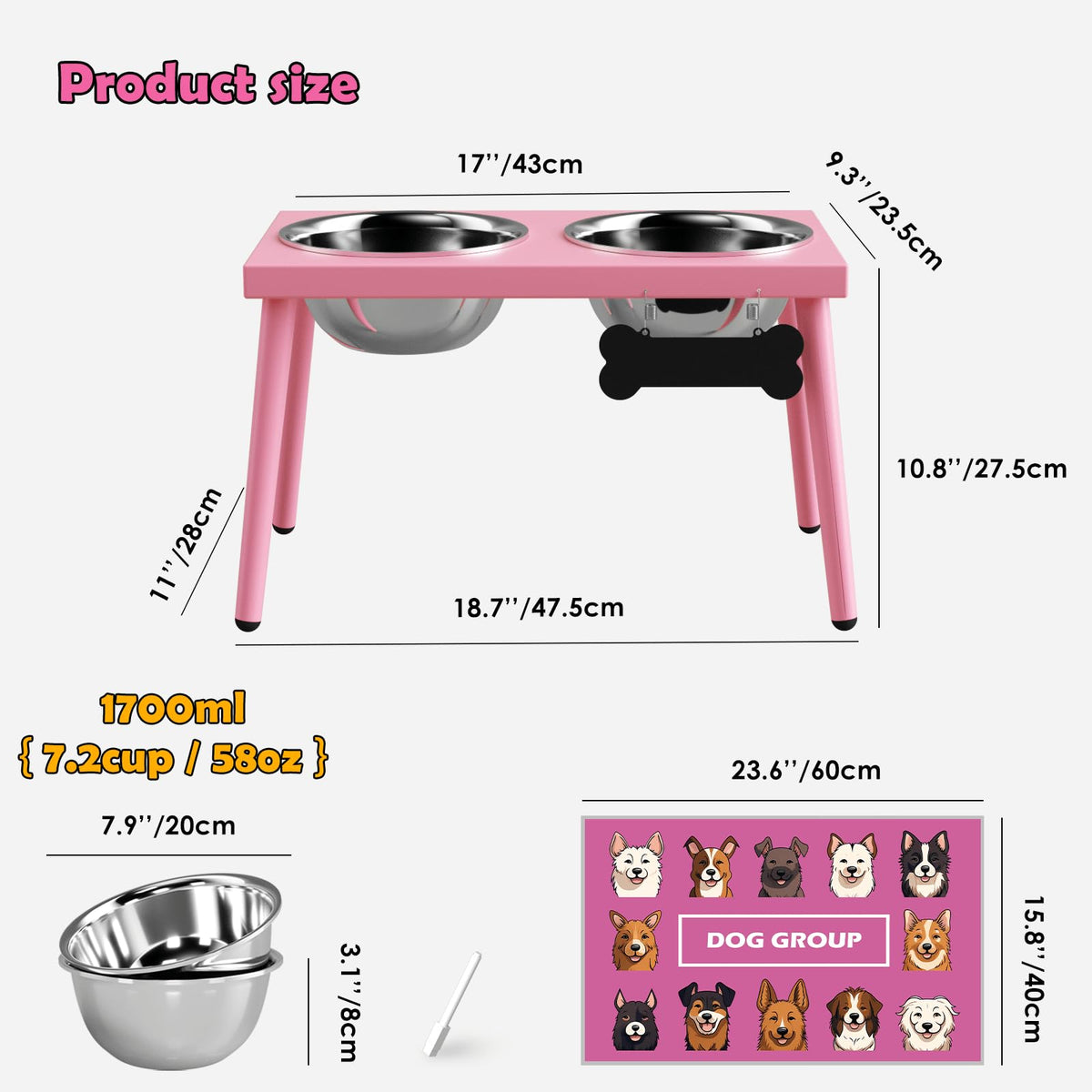 Adengl Raised Dog Bowl Stand For Large Medium Dogs, Elevated Dog Bowls With Sprill Proof Mat &Two 58Oz Stainless Steel Bowls,Pin