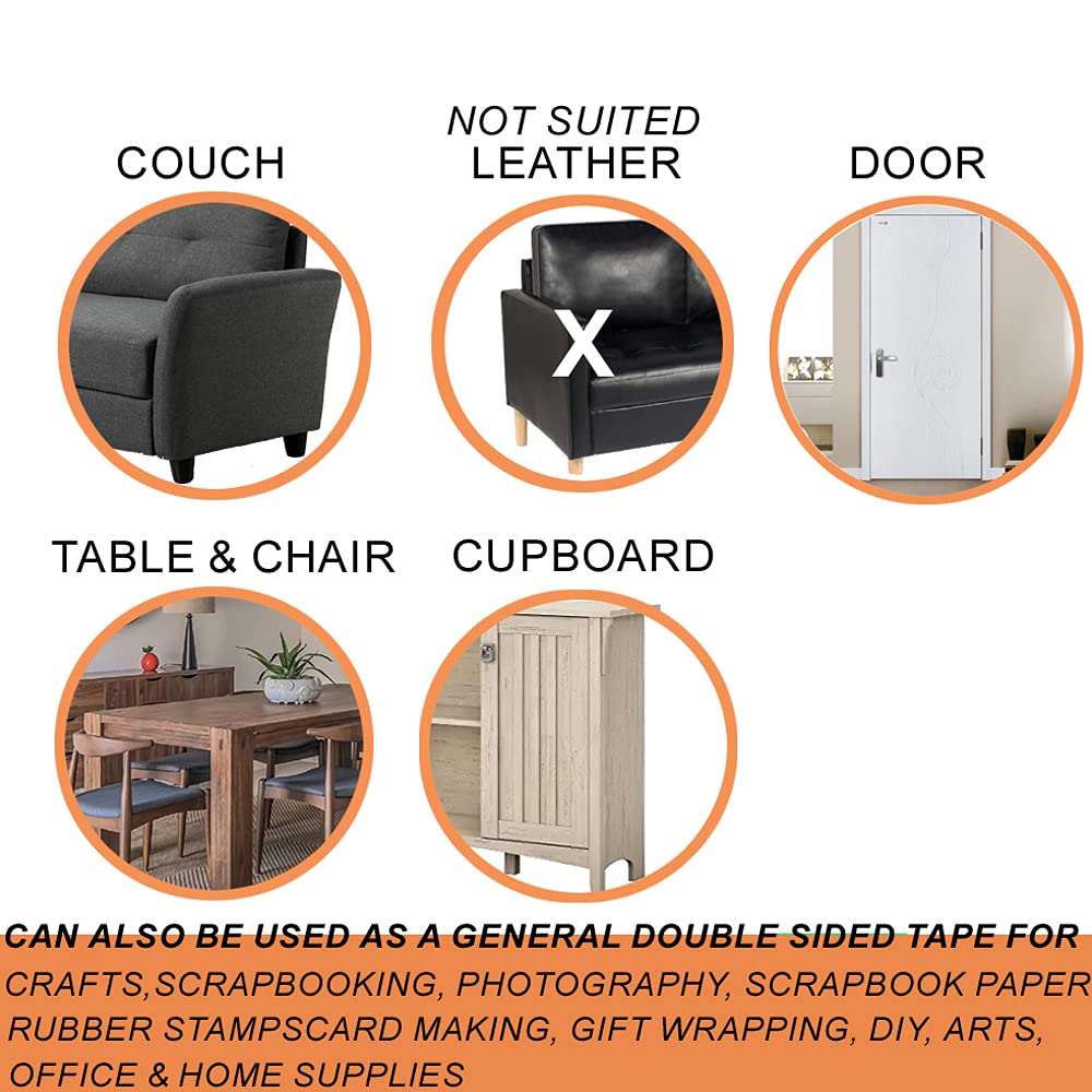 Q: Can this tape be used on all types of furniture?A: Yes, the tape is designed to adhere to a variety of surfaces, including suede, stained wood, fabric couches, and varnished doors. However, it should not be used on bonded or faux leather to avoid damage.